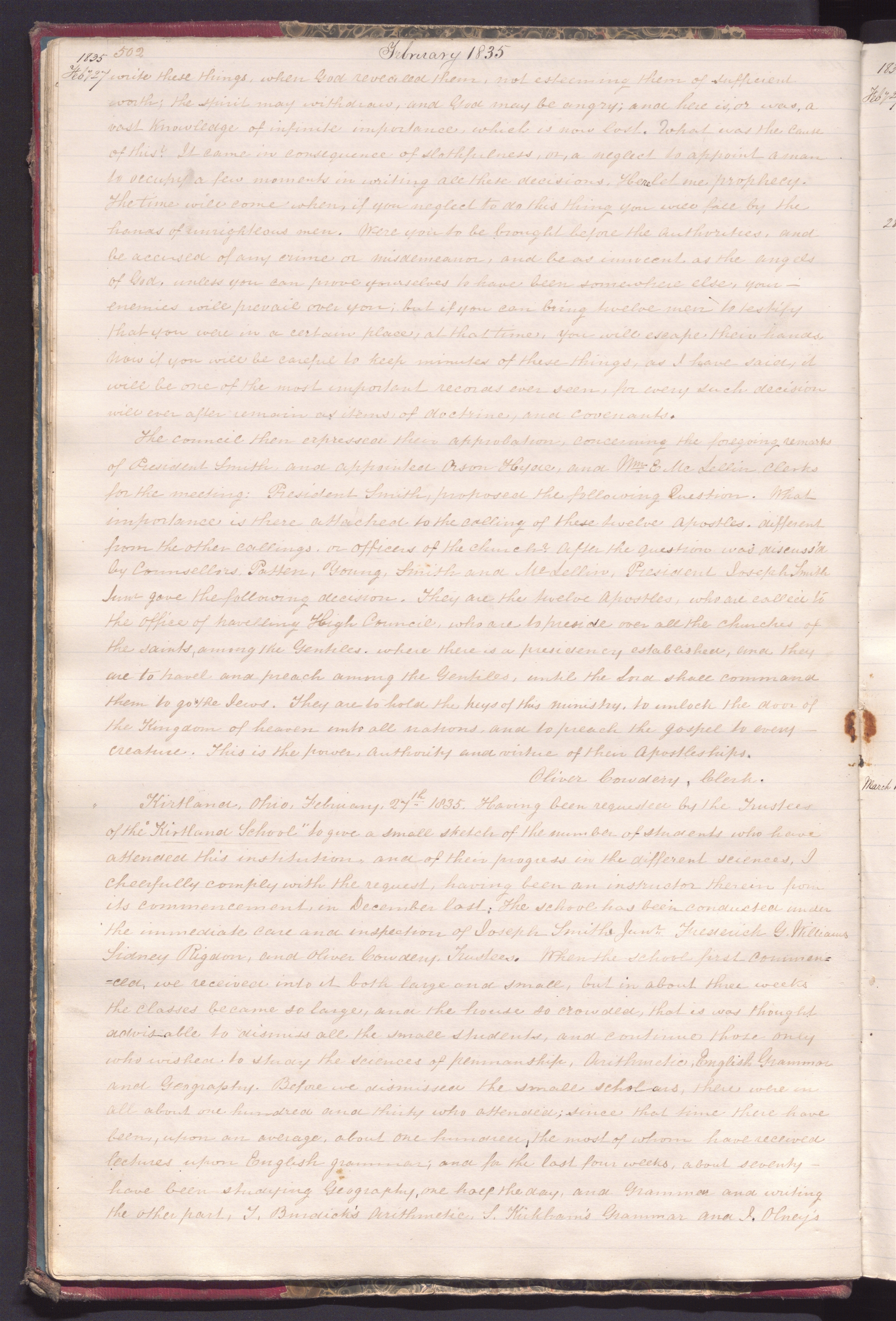JS, History, 1838–1856, vol. B-2, created 16 May–22 Aug. 1845 and ca. 21 July 1854; handwriting of , , , Jonathan Grimshaw, and ; 296 pages, plus one page of addenda; CHL. This is a copy of the second volume of a six-volume manuscript history of the church (JS History, 1838–1856, vol. B-1), and covers the period from 1 Sept. 1834 to 2 Nov. 1838. The copy also comprises four other volumes, labeled A-2, C-2, D-2, and E-2, and continues through 19 July 1843. The copy was discontinued 6 Aug. 1856 “by the advice of President ” (JS History, 1838–1856, vol. E-2, p. 83).