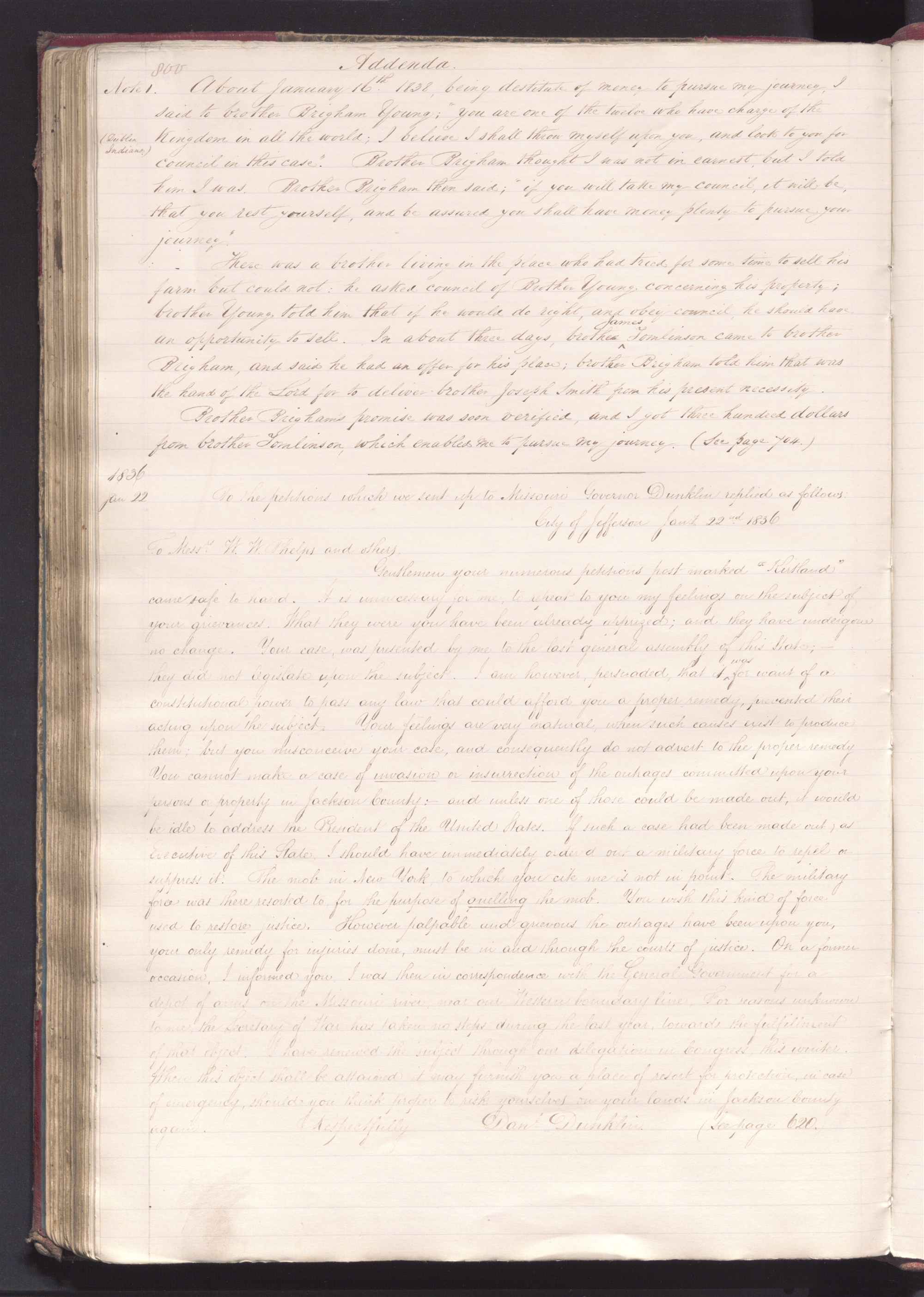 JS, History, 1838–1856, vol. B-2, created 16 May–22 Aug. 1845 and ca. 21 July 1854; handwriting of , , , Jonathan Grimshaw, and ; 296 pages, plus one page of addenda; CHL. This is a copy of the second volume of a six-volume manuscript history of the church (JS History, 1838–1856, vol. B-1), and covers the period from 1 Sept. 1834 to 2 Nov. 1838. The copy also comprises four other volumes, labeled A-2, C-2, D-2, and E-2, and continues through 19 July 1843. The copy was discontinued 6 Aug. 1856 “by the advice of President ” (JS History, 1838–1856, vol. E-2, p. 83).