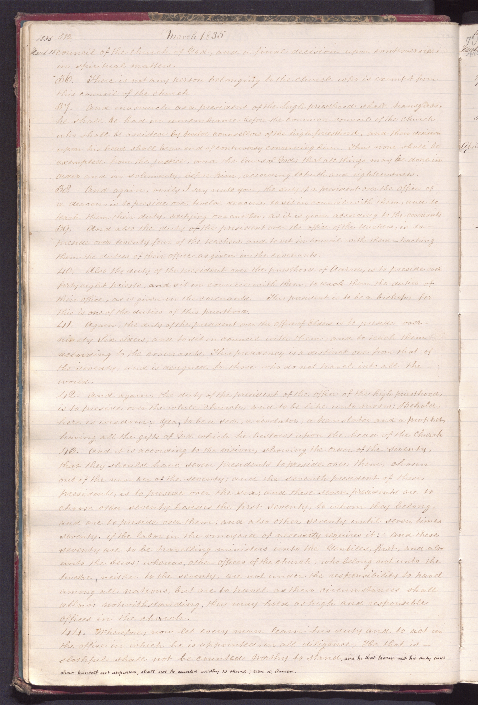 JS, History, 1838–1856, vol. B-2, created 16 May–22 Aug. 1845 and ca. 21 July 1854; handwriting of , , , Jonathan Grimshaw, and ; 296 pages, plus one page of addenda; CHL. This is a copy of the second volume of a six-volume manuscript history of the church (JS History, 1838–1856, vol. B-1), and covers the period from 1 Sept. 1834 to 2 Nov. 1838. The copy also comprises four other volumes, labeled A-2, C-2, D-2, and E-2, and continues through 19 July 1843. The copy was discontinued 6 Aug. 1856 “by the advice of President ” (JS History, 1838–1856, vol. E-2, p. 83).