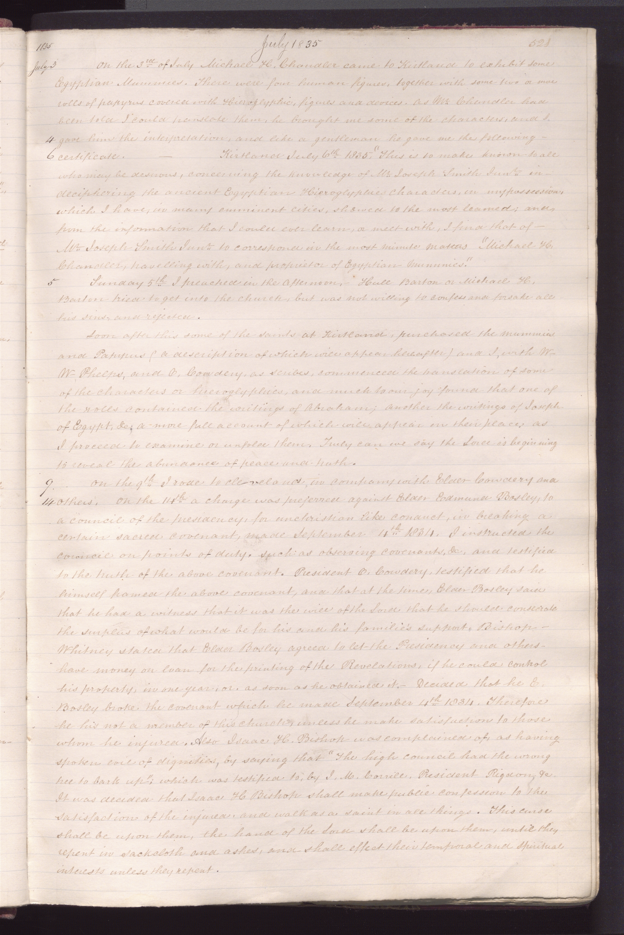JS, History, 1838–1856, vol. B-2, created 16 May–22 Aug. 1845 and ca. 21 July 1854; handwriting of , , , Jonathan Grimshaw, and ; 296 pages, plus one page of addenda; CHL. This is a copy of the second volume of a six-volume manuscript history of the church (JS History, 1838–1856, vol. B-1), and covers the period from 1 Sept. 1834 to 2 Nov. 1838. The copy also comprises four other volumes, labeled A-2, C-2, D-2, and E-2, and continues through 19 July 1843. The copy was discontinued 6 Aug. 1856 “by the advice of President ” (JS History, 1838–1856, vol. E-2, p. 83).