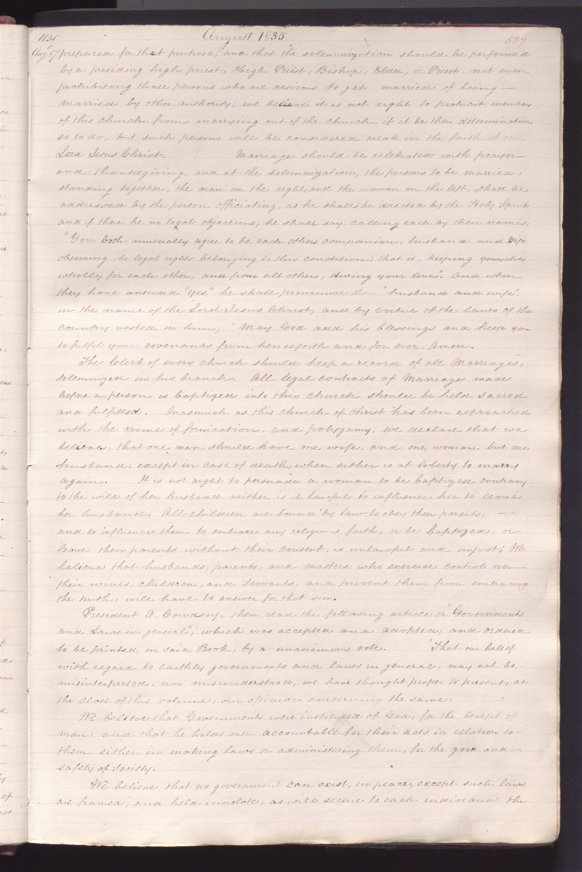 JS, History, 1838–1856, vol. B-2, created 16 May–22 Aug. 1845 and ca. 21 July 1854; handwriting of , , , Jonathan Grimshaw, and ; 296 pages, plus one page of addenda; CHL. This is a copy of the second volume of a six-volume manuscript history of the church (JS History, 1838–1856, vol. B-1), and covers the period from 1 Sept. 1834 to 2 Nov. 1838. The copy also comprises four other volumes, labeled A-2, C-2, D-2, and E-2, and continues through 19 July 1843. The copy was discontinued 6 Aug. 1856 “by the advice of President ” (JS History, 1838–1856, vol. E-2, p. 83).