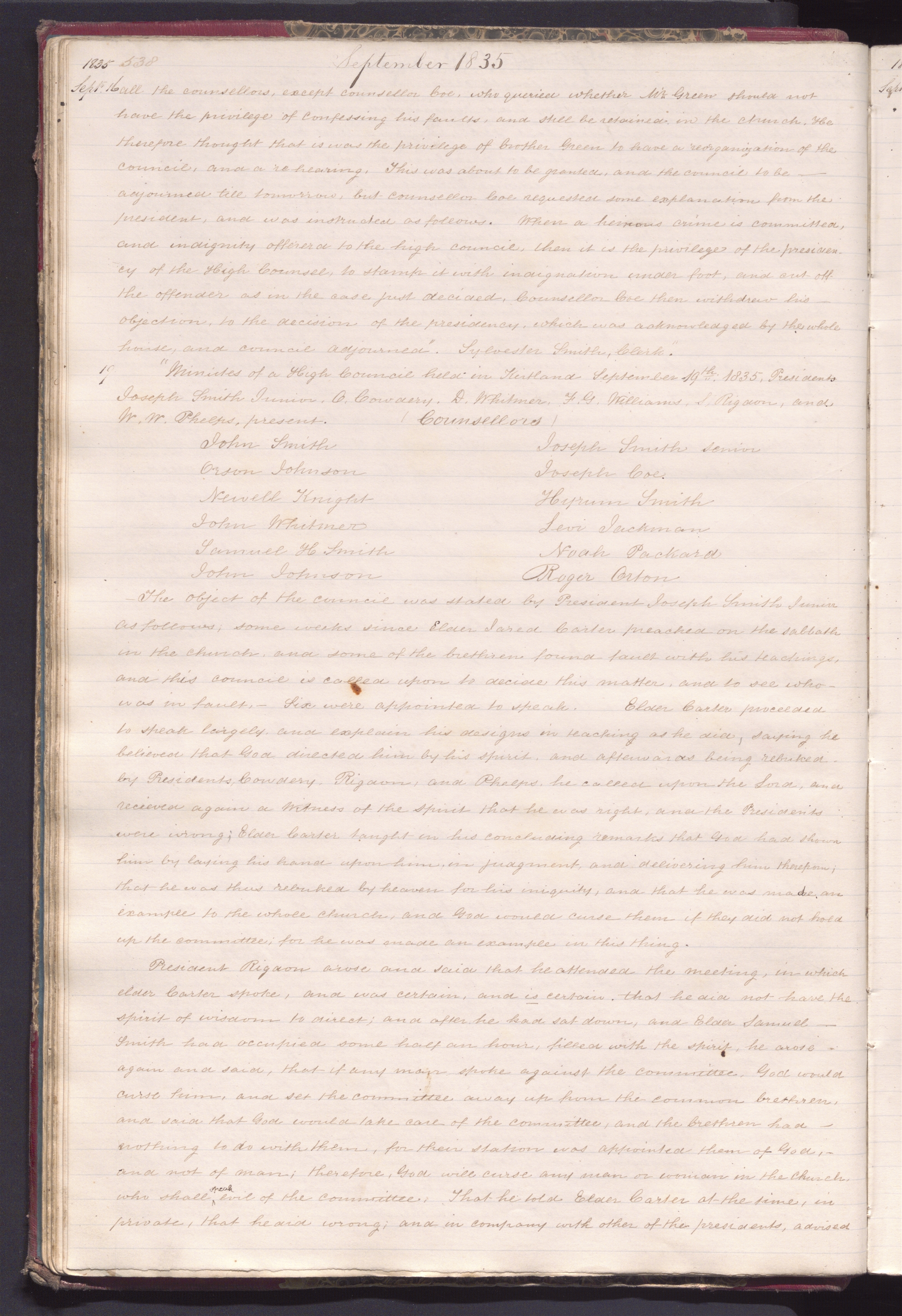 JS, History, 1838–1856, vol. B-2, created 16 May–22 Aug. 1845 and ca. 21 July 1854; handwriting of , , , Jonathan Grimshaw, and ; 296 pages, plus one page of addenda; CHL. This is a copy of the second volume of a six-volume manuscript history of the church (JS History, 1838–1856, vol. B-1), and covers the period from 1 Sept. 1834 to 2 Nov. 1838. The copy also comprises four other volumes, labeled A-2, C-2, D-2, and E-2, and continues through 19 July 1843. The copy was discontinued 6 Aug. 1856 “by the advice of President ” (JS History, 1838–1856, vol. E-2, p. 83).