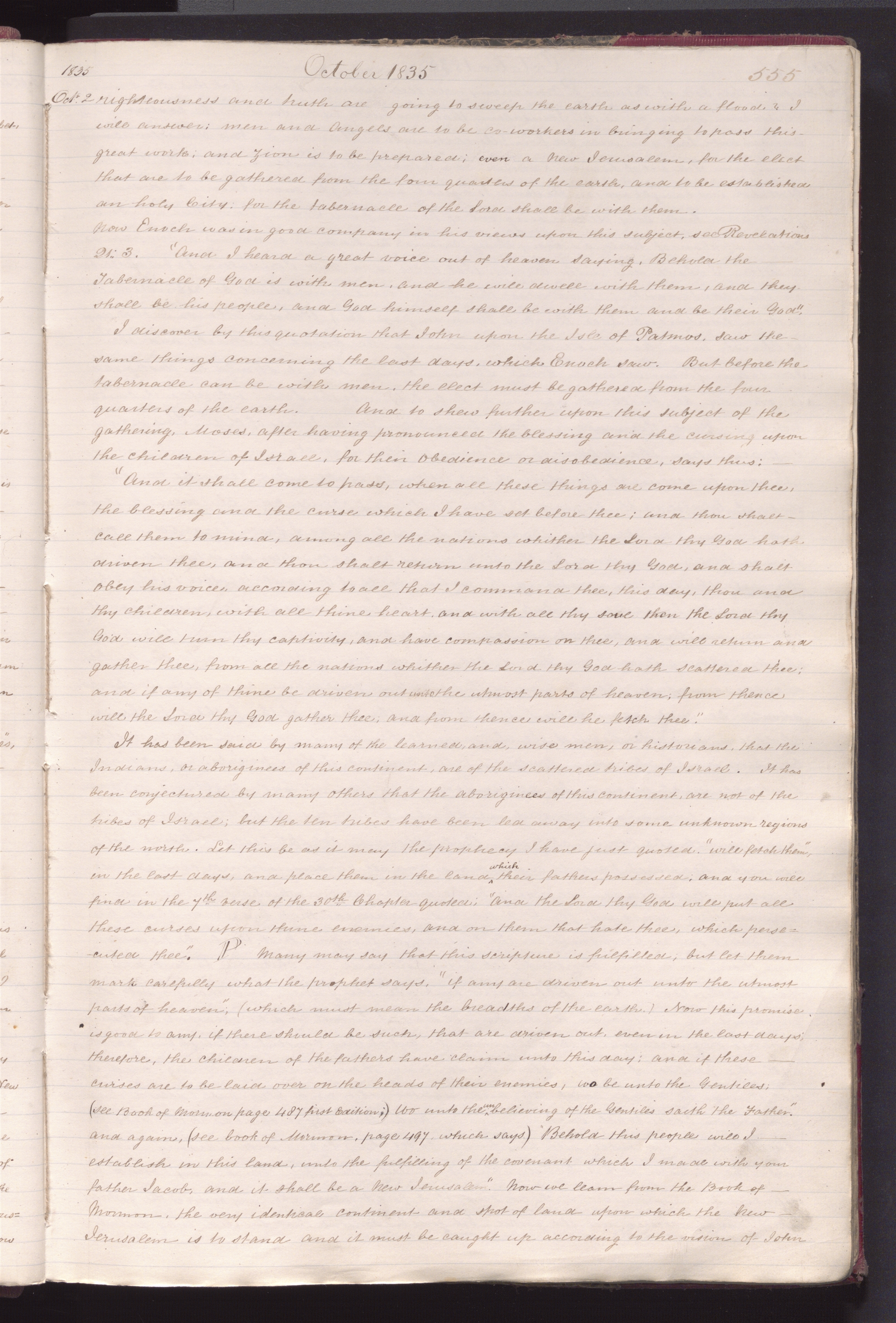 JS, History, 1838–1856, vol. B-2, created 16 May–22 Aug. 1845 and ca. 21 July 1854; handwriting of , , , Jonathan Grimshaw, and ; 296 pages, plus one page of addenda; CHL. This is a copy of the second volume of a six-volume manuscript history of the church (JS History, 1838–1856, vol. B-1), and covers the period from 1 Sept. 1834 to 2 Nov. 1838. The copy also comprises four other volumes, labeled A-2, C-2, D-2, and E-2, and continues through 19 July 1843. The copy was discontinued 6 Aug. 1856 “by the advice of President ” (JS History, 1838–1856, vol. E-2, p. 83).