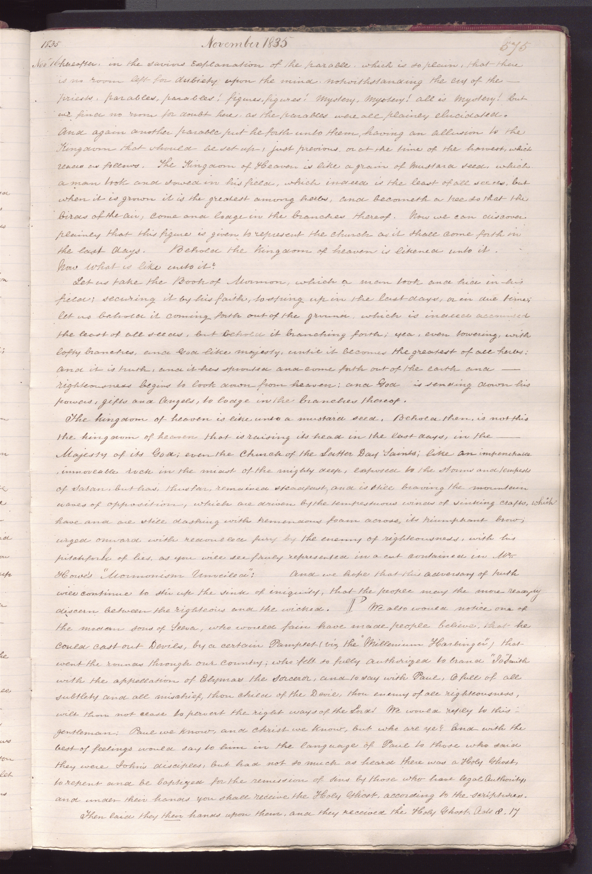 JS, History, 1838–1856, vol. B-2, created 16 May–22 Aug. 1845 and ca. 21 July 1854; handwriting of , , , Jonathan Grimshaw, and ; 296 pages, plus one page of addenda; CHL. This is a copy of the second volume of a six-volume manuscript history of the church (JS History, 1838–1856, vol. B-1), and covers the period from 1 Sept. 1834 to 2 Nov. 1838. The copy also comprises four other volumes, labeled A-2, C-2, D-2, and E-2, and continues through 19 July 1843. The copy was discontinued 6 Aug. 1856 “by the advice of President ” (JS History, 1838–1856, vol. E-2, p. 83).