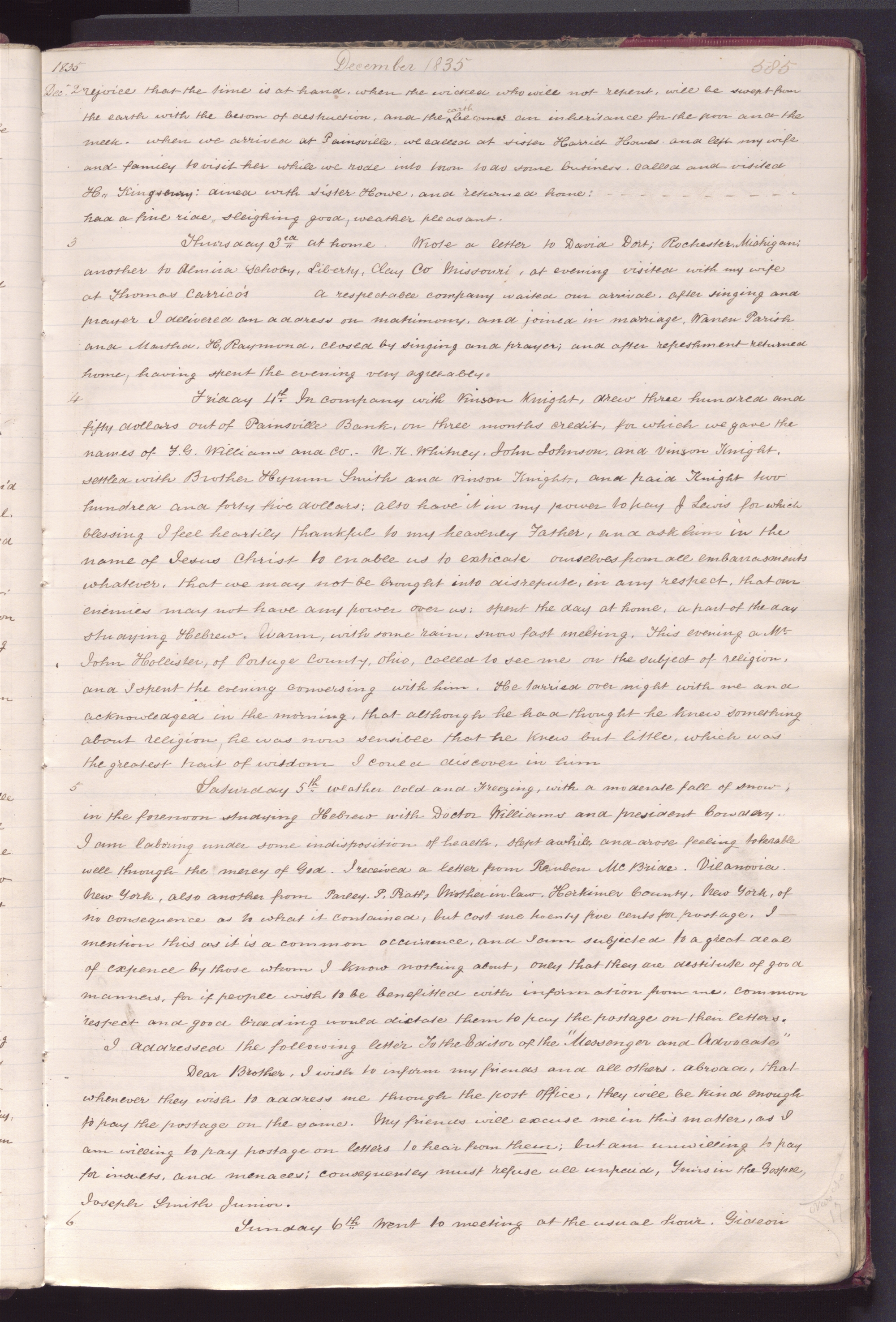 JS, History, 1838–1856, vol. B-2, created 16 May–22 Aug. 1845 and ca. 21 July 1854; handwriting of , , , Jonathan Grimshaw, and ; 296 pages, plus one page of addenda; CHL. This is a copy of the second volume of a six-volume manuscript history of the church (JS History, 1838–1856, vol. B-1), and covers the period from 1 Sept. 1834 to 2 Nov. 1838. The copy also comprises four other volumes, labeled A-2, C-2, D-2, and E-2, and continues through 19 July 1843. The copy was discontinued 6 Aug. 1856 “by the advice of President ” (JS History, 1838–1856, vol. E-2, p. 83).