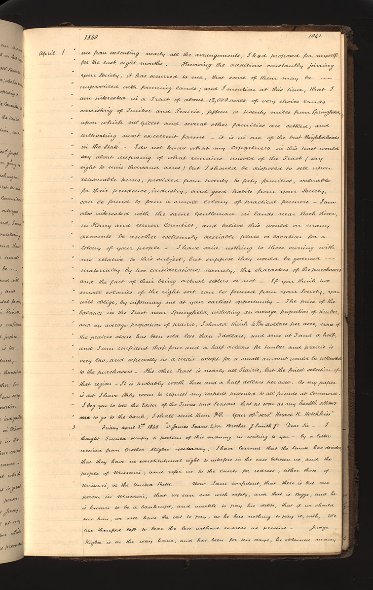 <April 1> me from executing nearly all the arrangements, I had proposed for myself for the last eight months. Knowing the additions constantly joining your Society, it has occurred to me, that some of them may be unprovided with farming lands; and I mention at this time, that I am interested in a Tract of about 12,000 acres of very choice lands consisting of Timber and Prairie, fifteen or twenty miles from , upon which Mr. Gillet and several other families are settled, and cultivating most excellent farms— it is one of the best Neighborhoods in the . I do not know what my Copartners in this tract would say about disposing of what remains unsold of the Tract (say eight to nine thousand acres) but I should be disposed to sell upon reasonable terms, provided from twenty to forty families, valuable for their prudence, industry, and good habits from your Society, can be found to form a small Colony of practical farmers— I am also interested with the same Gentleman in lands near Rock River, in Henry and Mercer Counties, and believe this would on many accounts be another extremely desirable place or location for a Colony of your people— I have said nothing to those owning with me relative to this subject, but suppose they would be governed materially by two considerations; namely, the characters of the purchasers and the fact of their being actual settlers or not— If you think two small colonies of the right sort can be formed from your Society, you will oblige, by informing me at your earliest opportunity— The price of the balance in the Tract near , including an average proportion of timber, and an average proportion of prairie, I should think 450/100 dollars per acre, none of the prairie alone has been sold less than 3 dollars, and some at 3 and a half, and I am confident that four and a half dollars for timber and prairie is very low, and especially as a credit except for a small amount would be extended to the purchasers— The other Tract is nearly all Prairie, but the finest selection of that region. It is probably worth three and a half dollars per acre. [HC 4:101] As my paper is out I have only room to request my respects presented to all friends at . I beg you to tell the Editor of the Times and Seasons that as soon as my health allows me to go to the bank, I shall send them $10. Your obt. servt. ”