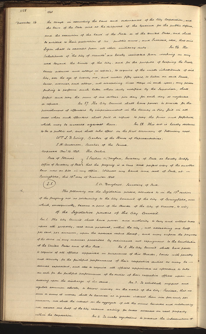 <December 16> the Mayor in executing the laws and ordinances of the City Corporation, and the laws of the and at the disposal of the Governor for the public defence, and the of the laws of the or of the , and shall be entitled to their proportion of the public arms; and Provided, also, that said Legion shall be exempt from all other military duty. Sec 26. The Inhabitants of “the City of ” are hereby exempted from working on any road beyond the limits of the , and for the purpose of keeping the Streets, lanes avenues and alleys in repair, to require of the male inhabitants of said , over the age of twenty one, and under fifty years, to labor on said Streets, lanes, avenues, and alleys, not exceeding three days in each year; any person failing to perform such labor when duly notified by the Supervisor, shall forfeit and pay the sum of one dollar per day for each day so neglected or refused. Sec 27. The City Council shall have power to provide for the punishment of offenders by imprisonment in the or Jail in all cases when such offenders shall fail or refuse to pay the fines and forfeitures, which may be recovered against them. [HC 4:244] Sec. 28. This act is hereby declared to be a public act, and shall take effect on the first Monday of February next.