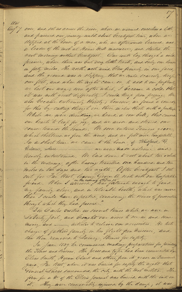 <1841 Augt. 7 > over, and set us across the river, where we warmed ourselves a little, and pursued our journey until about breakfast time, when we stopped at the house of a man, who, we afterwards learned, was a leader of the mob at massacre; and started the next morning without breakfast. Our route lay through a wild prairie, where there was but very little track, and only one house in forty miles. The north-west wind blew fiercely in our faces, and the ground was so slippery that we could scarcely keep our feet, and when the night came on, to add to our perplexity, we lost our way; soon after which, I become so cold that it was with great difficulty I could keep from freezing. We also became extremely thirsty; however, we found a remedy for this by cutting through ice three inches thick with a penknife. While we were drinking, we heard a cow bell; this caused our hearts to leap for joy, and we arose and steered our course towards the sound. We soon entered Tenneys grove, which sheltered us from the wind, and we felt more comfortable. In a short time we came to the house, of Whitford G. Wilson, where—— we were made welcome and kindly entertained. We laid down to rest about two o’clock in the morning, after having travelled one hundred and ten miles in two days and two nights. After breakfast I set out for , leaving sick with our hospitable friend. When I arrived <on the evening of Dec 25> I was fortunate enough to find my family alive, and in tolerable health; which was more than I could have expected, considering the scenes of persecution through which they had passed.”