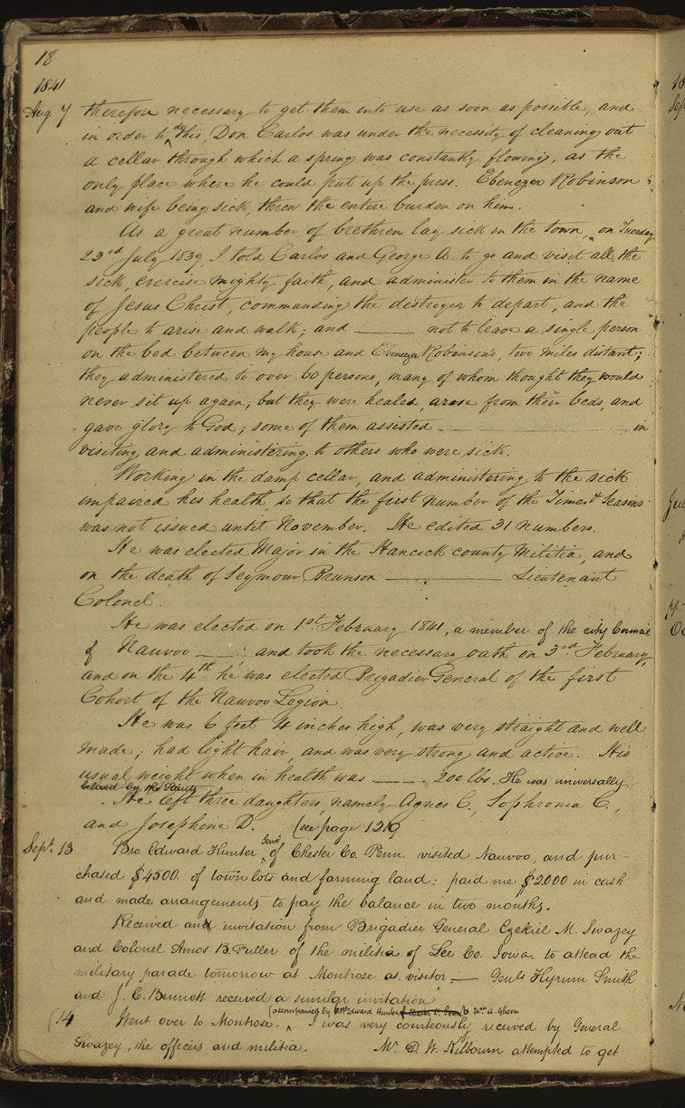 <Sept. 13> Bro. Edward Hunter <Senr.> of Penn. visited , and purchased $4500. of town lots and farming land: paid me $2.000 in cash and made arrangements to pay the balance in two months.