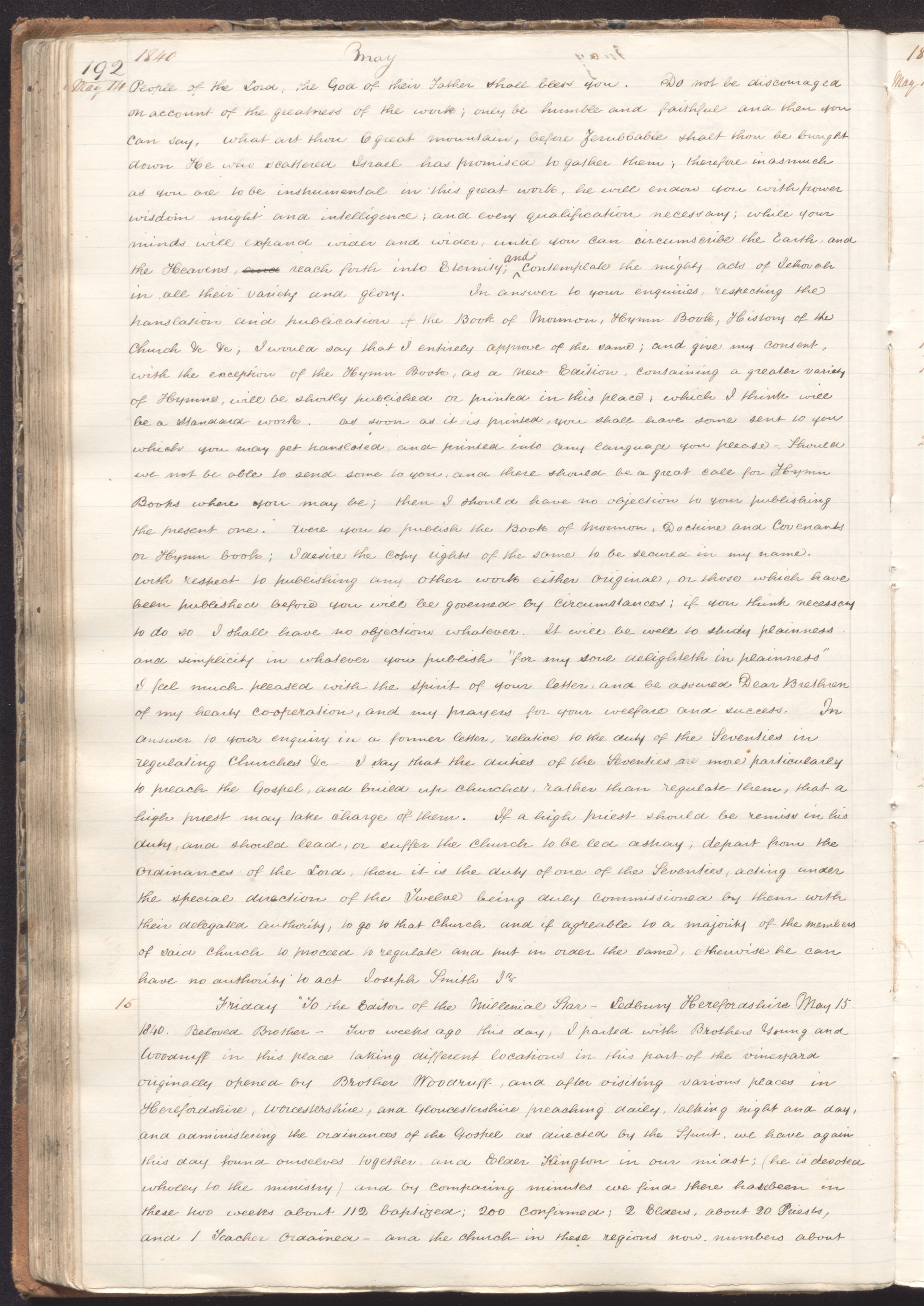 JS, History, 1838–1856, vol. C-2, created 2 Aug. 1845–3 Feb. 1846, 8 Nov. 1854–2 Oct. 1855, and 10 Mar. 1862; handwriting of , , , Jonathan Grimshaw, and Robert L. Campbell; 520 pages, plus eight pages of addenda; CHL. This is a copy of the third volume of a six-volume manuscript history of the church (JS History, 1838–1856, vol. C-1), and covers the period from 2 Nov. 1838 to 31 July 1842. The copy also comprises four other volumes, labeled A-2, B-2, D-2, and E-2, and continues through 19 July 1843. The copy was discontinued 6 Aug. 1856 “by the advice of President ” (JS History, 1838–1856, vol. E-2, p. 83).