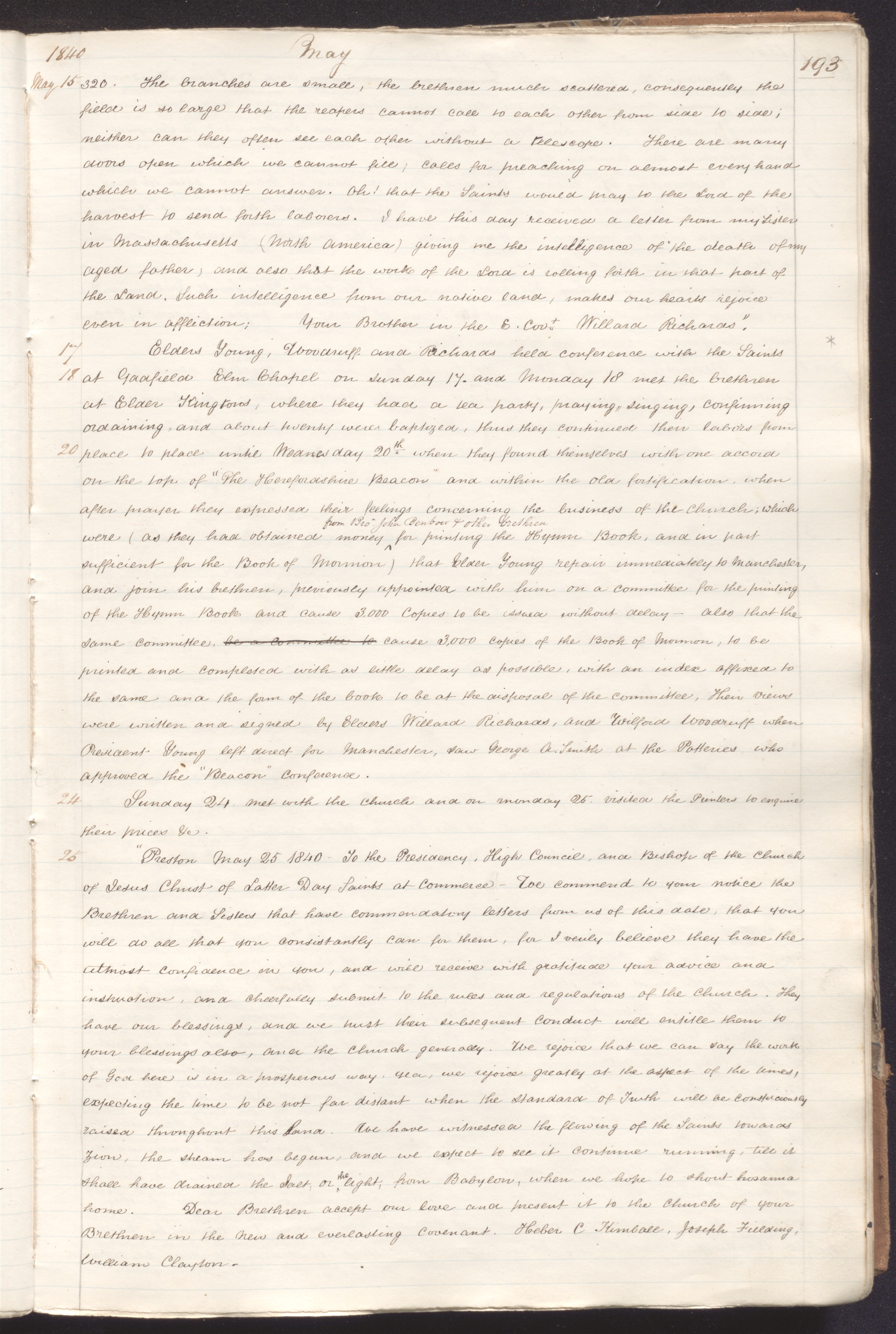JS, History, 1838–1856, vol. C-2, created 2 Aug. 1845–3 Feb. 1846, 8 Nov. 1854–2 Oct. 1855, and 10 Mar. 1862; handwriting of , , , Jonathan Grimshaw, and Robert L. Campbell; 520 pages, plus eight pages of addenda; CHL. This is a copy of the third volume of a six-volume manuscript history of the church (JS History, 1838–1856, vol. C-1), and covers the period from 2 Nov. 1838 to 31 July 1842. The copy also comprises four other volumes, labeled A-2, B-2, D-2, and E-2, and continues through 19 July 1843. The copy was discontinued 6 Aug. 1856 “by the advice of President ” (JS History, 1838–1856, vol. E-2, p. 83).