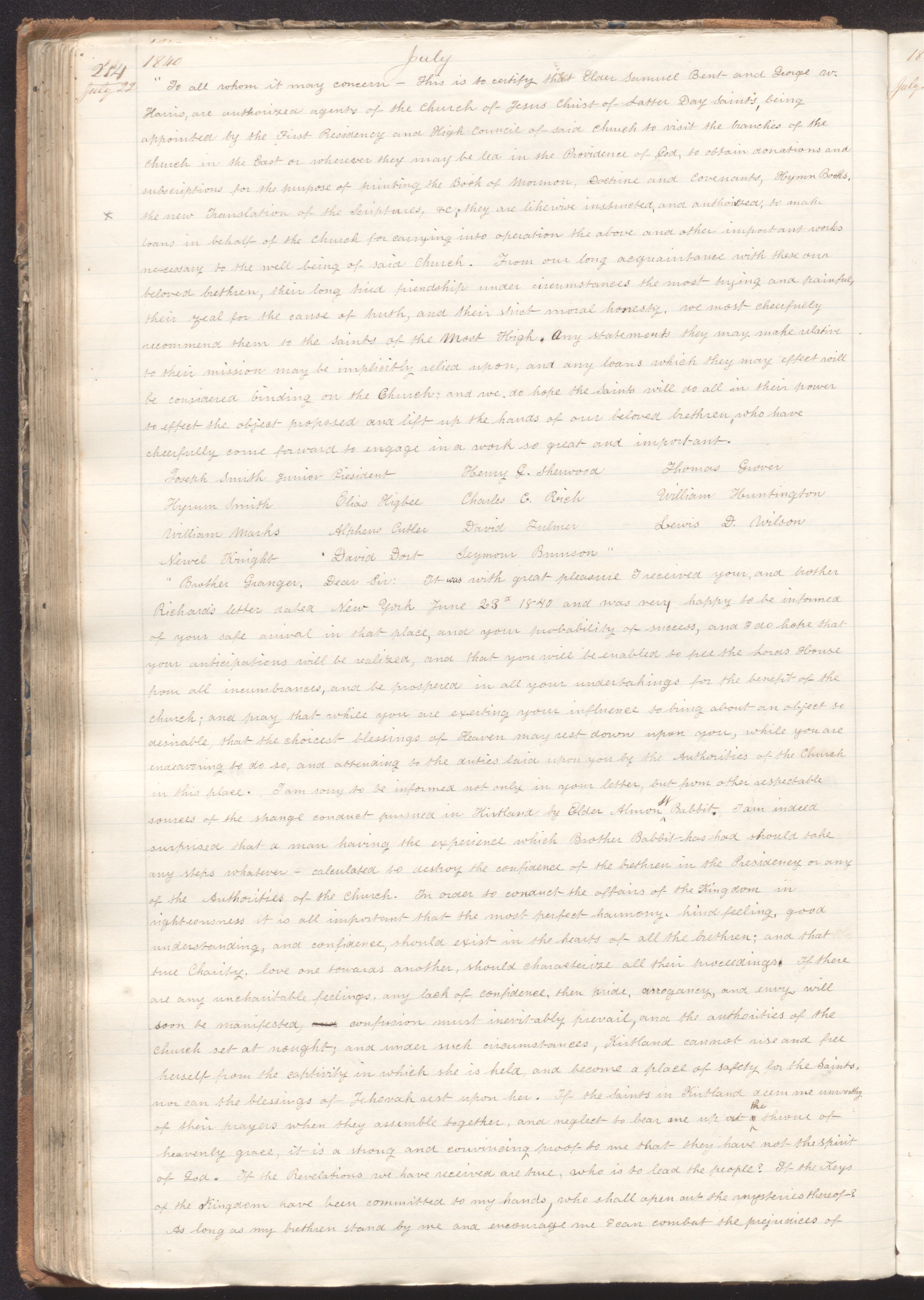 JS, History, 1838–1856, vol. C-2, created 2 Aug. 1845–3 Feb. 1846, 8 Nov. 1854–2 Oct. 1855, and 10 Mar. 1862; handwriting of , , , Jonathan Grimshaw, and Robert L. Campbell; 520 pages, plus eight pages of addenda; CHL. This is a copy of the third volume of a six-volume manuscript history of the church (JS History, 1838–1856, vol. C-1), and covers the period from 2 Nov. 1838 to 31 July 1842. The copy also comprises four other volumes, labeled A-2, B-2, D-2, and E-2, and continues through 19 July 1843. The copy was discontinued 6 Aug. 1856 “by the advice of President ” (JS History, 1838–1856, vol. E-2, p. 83).