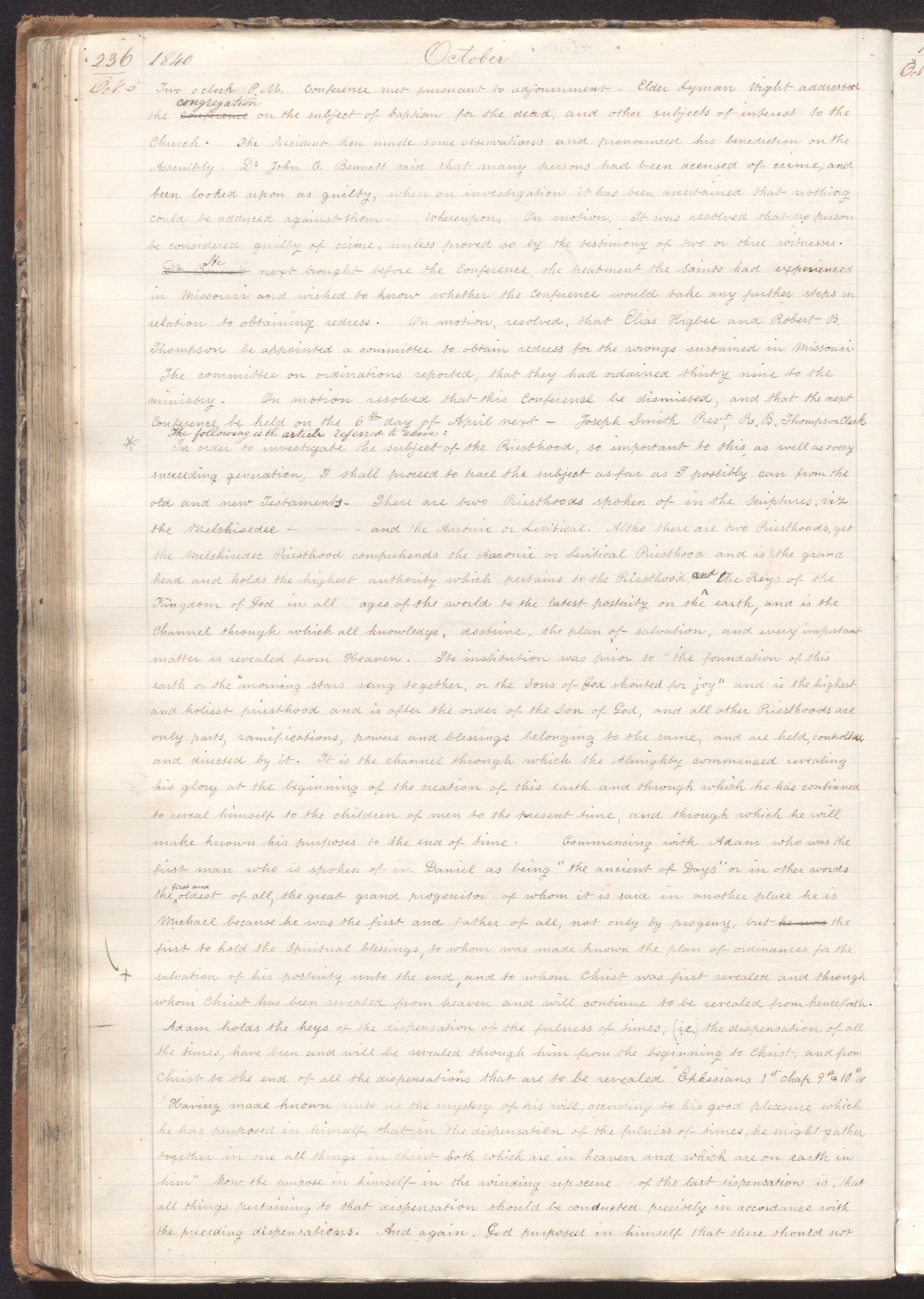 JS, History, 1838–1856, vol. C-2, created 2 Aug. 1845–3 Feb. 1846, 8 Nov. 1854–2 Oct. 1855, and 10 Mar. 1862; handwriting of , , , Jonathan Grimshaw, and Robert L. Campbell; 520 pages, plus eight pages of addenda; CHL. This is a copy of the third volume of a six-volume manuscript history of the church (JS History, 1838–1856, vol. C-1), and covers the period from 2 Nov. 1838 to 31 July 1842. The copy also comprises four other volumes, labeled A-2, B-2, D-2, and E-2, and continues through 19 July 1843. The copy was discontinued 6 Aug. 1856 “by the advice of President ” (JS History, 1838–1856, vol. E-2, p. 83).