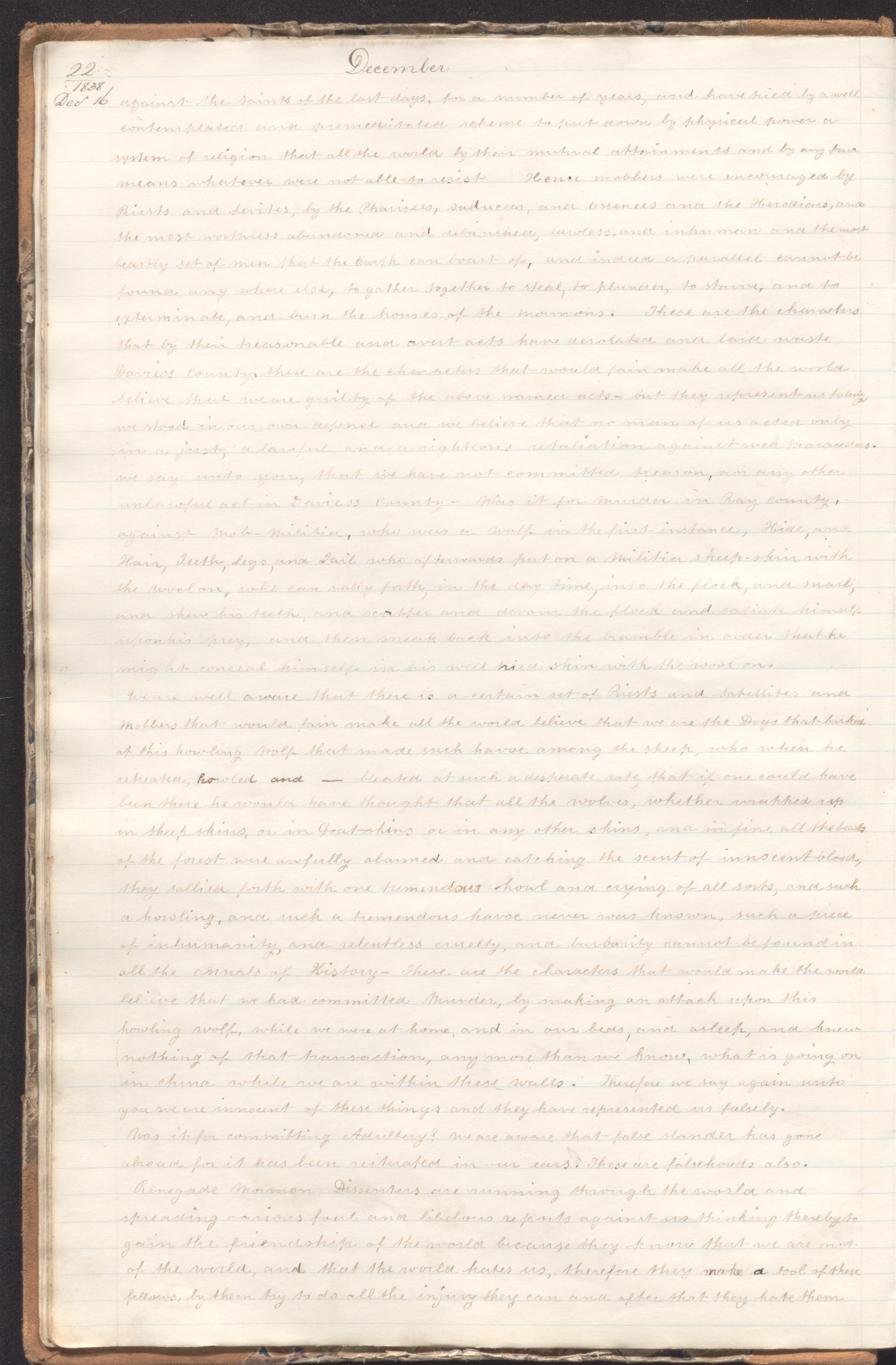 JS, History, 1838–1856, vol. C-2, created 2 Aug. 1845–3 Feb. 1846, 8 Nov. 1854–2 Oct. 1855, and 10 Mar. 1862; handwriting of , , , Jonathan Grimshaw, and Robert L. Campbell; 520 pages, plus eight pages of addenda; CHL. This is a copy of the third volume of a six-volume manuscript history of the church (JS History, 1838–1856, vol. C-1), and covers the period from 2 Nov. 1838 to 31 July 1842. The copy also comprises four other volumes, labeled A-2, B-2, D-2, and E-2, and continues through 19 July 1843. The copy was discontinued 6 Aug. 1856 “by the advice of President ” (JS History, 1838–1856, vol. E-2, p. 83).