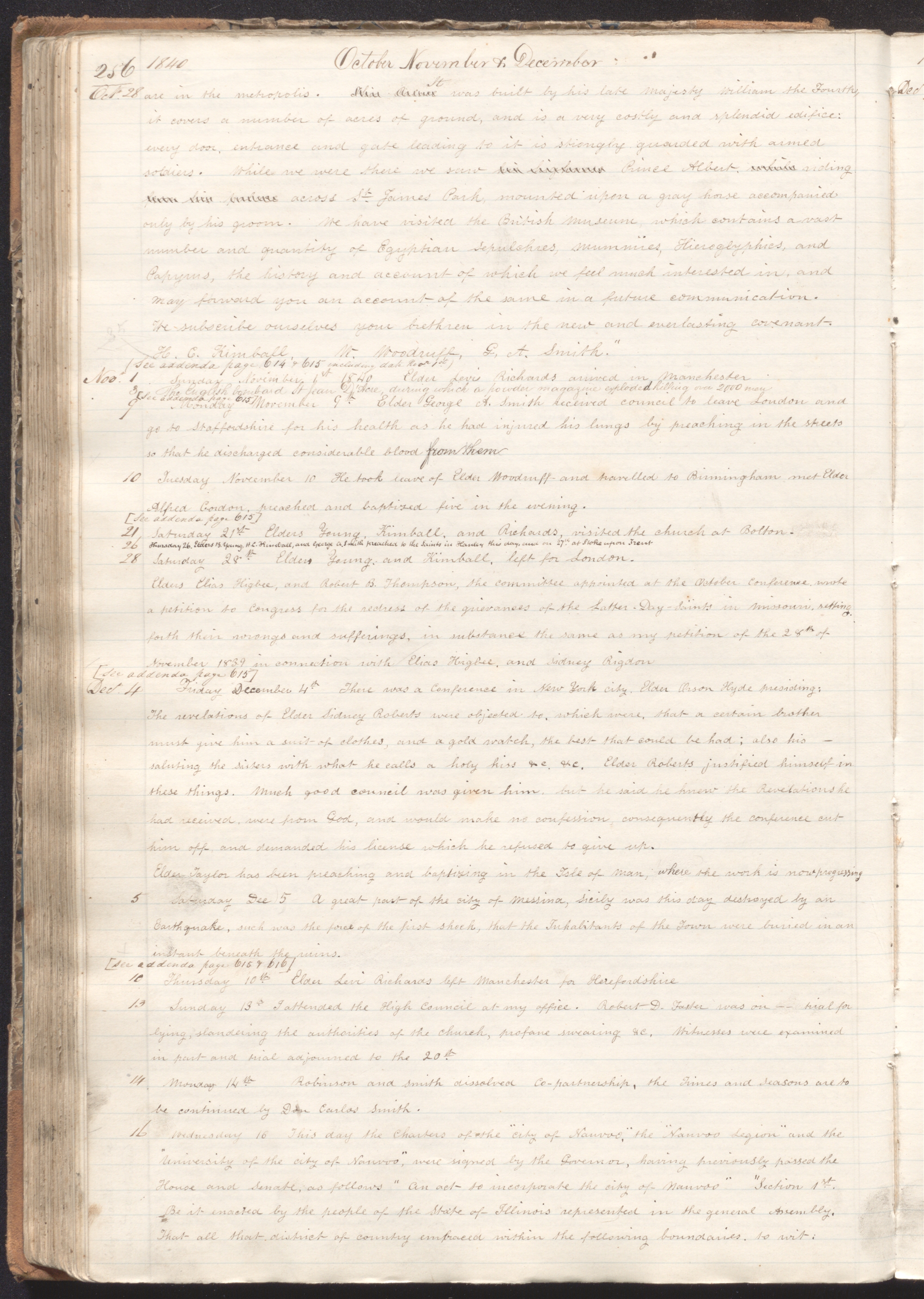 JS, History, 1838–1856, vol. C-2, created 2 Aug. 1845–3 Feb. 1846, 8 Nov. 1854–2 Oct. 1855, and 10 Mar. 1862; handwriting of , , , Jonathan Grimshaw, and Robert L. Campbell; 520 pages, plus eight pages of addenda; CHL. This is a copy of the third volume of a six-volume manuscript history of the church (JS History, 1838–1856, vol. C-1), and covers the period from 2 Nov. 1838 to 31 July 1842. The copy also comprises four other volumes, labeled A-2, B-2, D-2, and E-2, and continues through 19 July 1843. The copy was discontinued 6 Aug. 1856 “by the advice of President ” (JS History, 1838–1856, vol. E-2, p. 83).