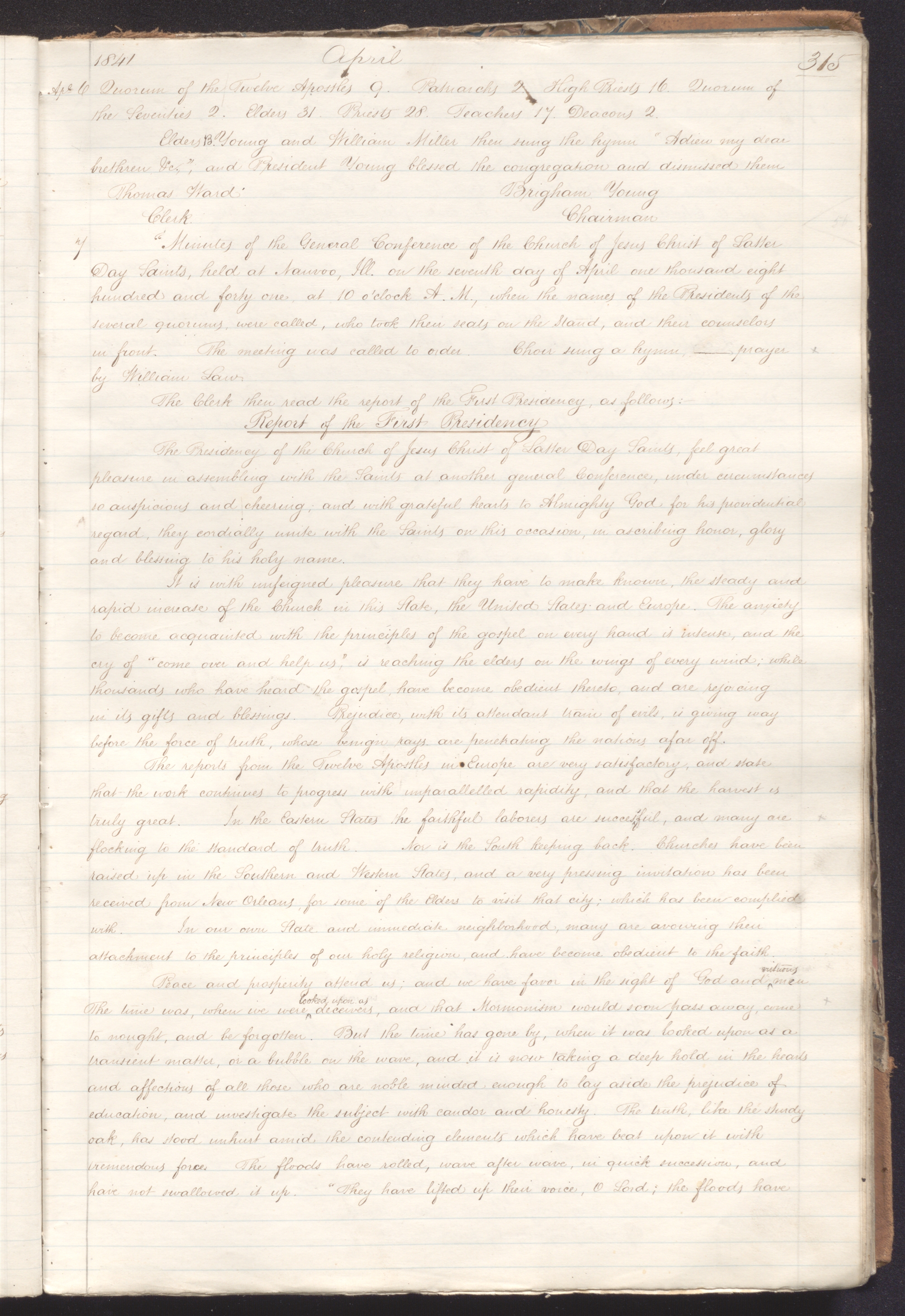 JS, History, 1838–1856, vol. C-2, created 2 Aug. 1845–3 Feb. 1846, 8 Nov. 1854–2 Oct. 1855, and 10 Mar. 1862; handwriting of , , , Jonathan Grimshaw, and Robert L. Campbell; 520 pages, plus eight pages of addenda; CHL. This is a copy of the third volume of a six-volume manuscript history of the church (JS History, 1838–1856, vol. C-1), and covers the period from 2 Nov. 1838 to 31 July 1842. The copy also comprises four other volumes, labeled A-2, B-2, D-2, and E-2, and continues through 19 July 1843. The copy was discontinued 6 Aug. 1856 “by the advice of President ” (JS History, 1838–1856, vol. E-2, p. 83).