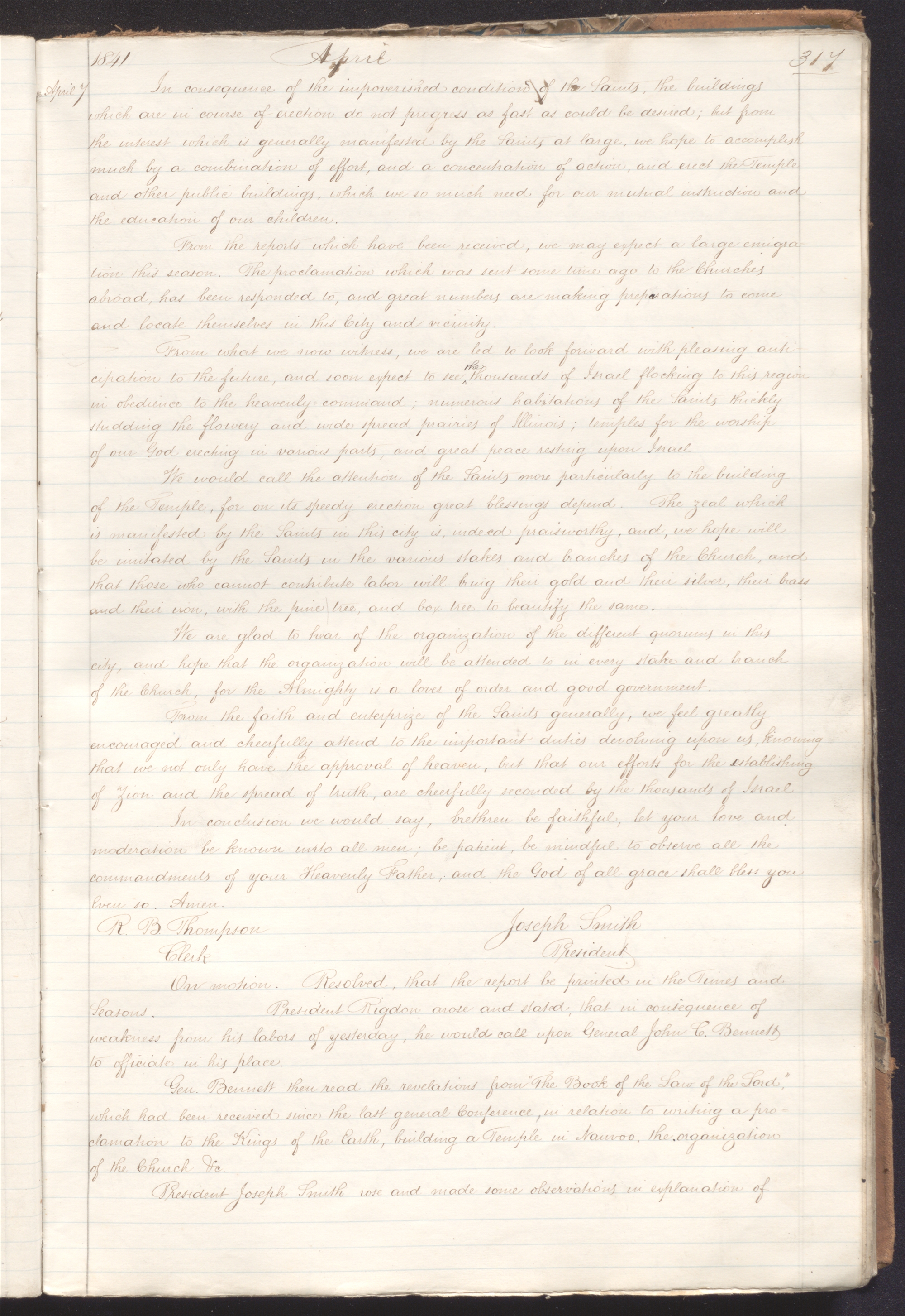 JS, History, 1838–1856, vol. C-2, created 2 Aug. 1845–3 Feb. 1846, 8 Nov. 1854–2 Oct. 1855, and 10 Mar. 1862; handwriting of , , , Jonathan Grimshaw, and Robert L. Campbell; 520 pages, plus eight pages of addenda; CHL. This is a copy of the third volume of a six-volume manuscript history of the church (JS History, 1838–1856, vol. C-1), and covers the period from 2 Nov. 1838 to 31 July 1842. The copy also comprises four other volumes, labeled A-2, B-2, D-2, and E-2, and continues through 19 July 1843. The copy was discontinued 6 Aug. 1856 “by the advice of President ” (JS History, 1838–1856, vol. E-2, p. 83).