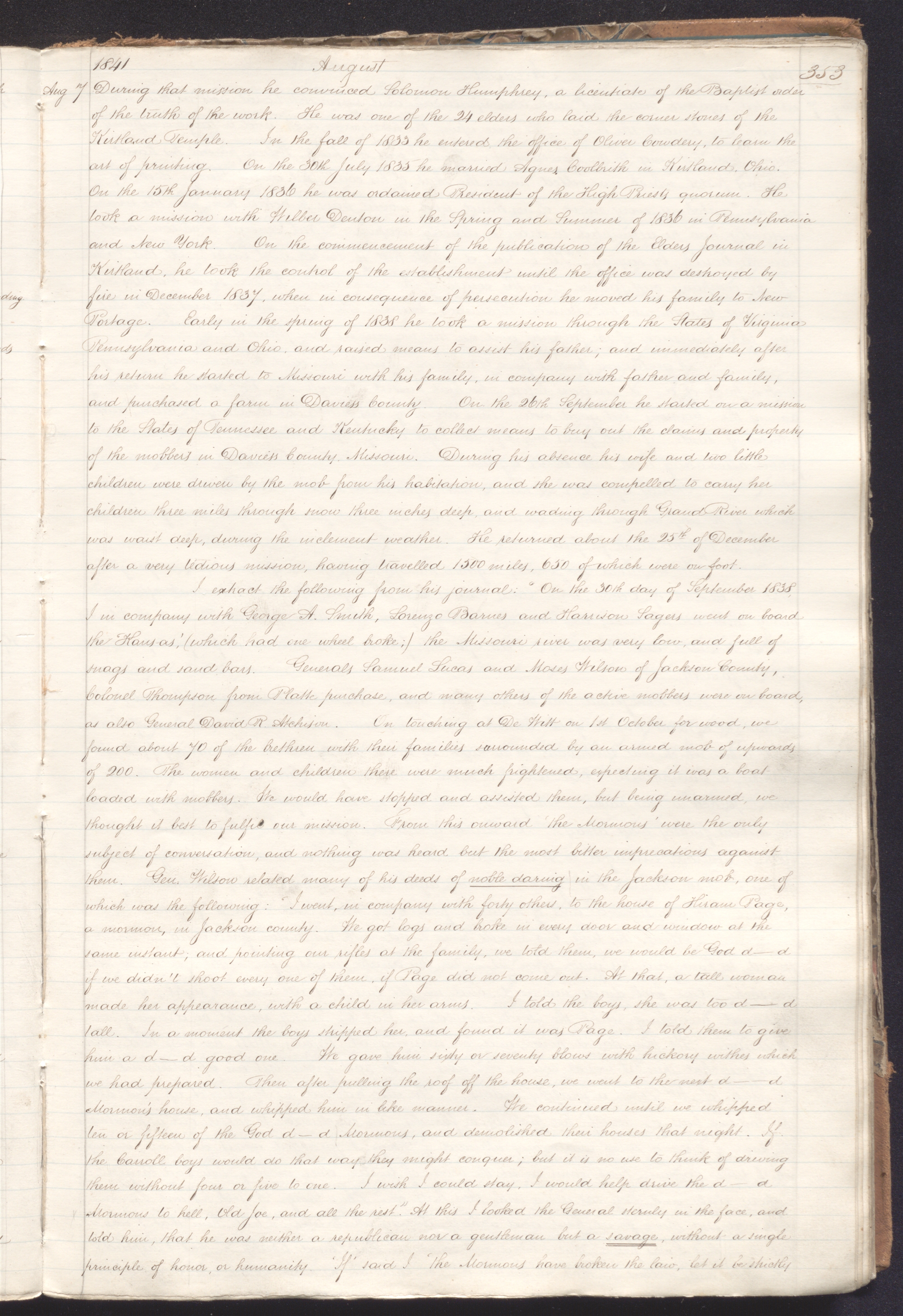 JS, History, 1838–1856, vol. C-2, created 2 Aug. 1845–3 Feb. 1846, 8 Nov. 1854–2 Oct. 1855, and 10 Mar. 1862; handwriting of , , , Jonathan Grimshaw, and Robert L. Campbell; 520 pages, plus eight pages of addenda; CHL. This is a copy of the third volume of a six-volume manuscript history of the church (JS History, 1838–1856, vol. C-1), and covers the period from 2 Nov. 1838 to 31 July 1842. The copy also comprises four other volumes, labeled A-2, B-2, D-2, and E-2, and continues through 19 July 1843. The copy was discontinued 6 Aug. 1856 “by the advice of President ” (JS History, 1838–1856, vol. E-2, p. 83).