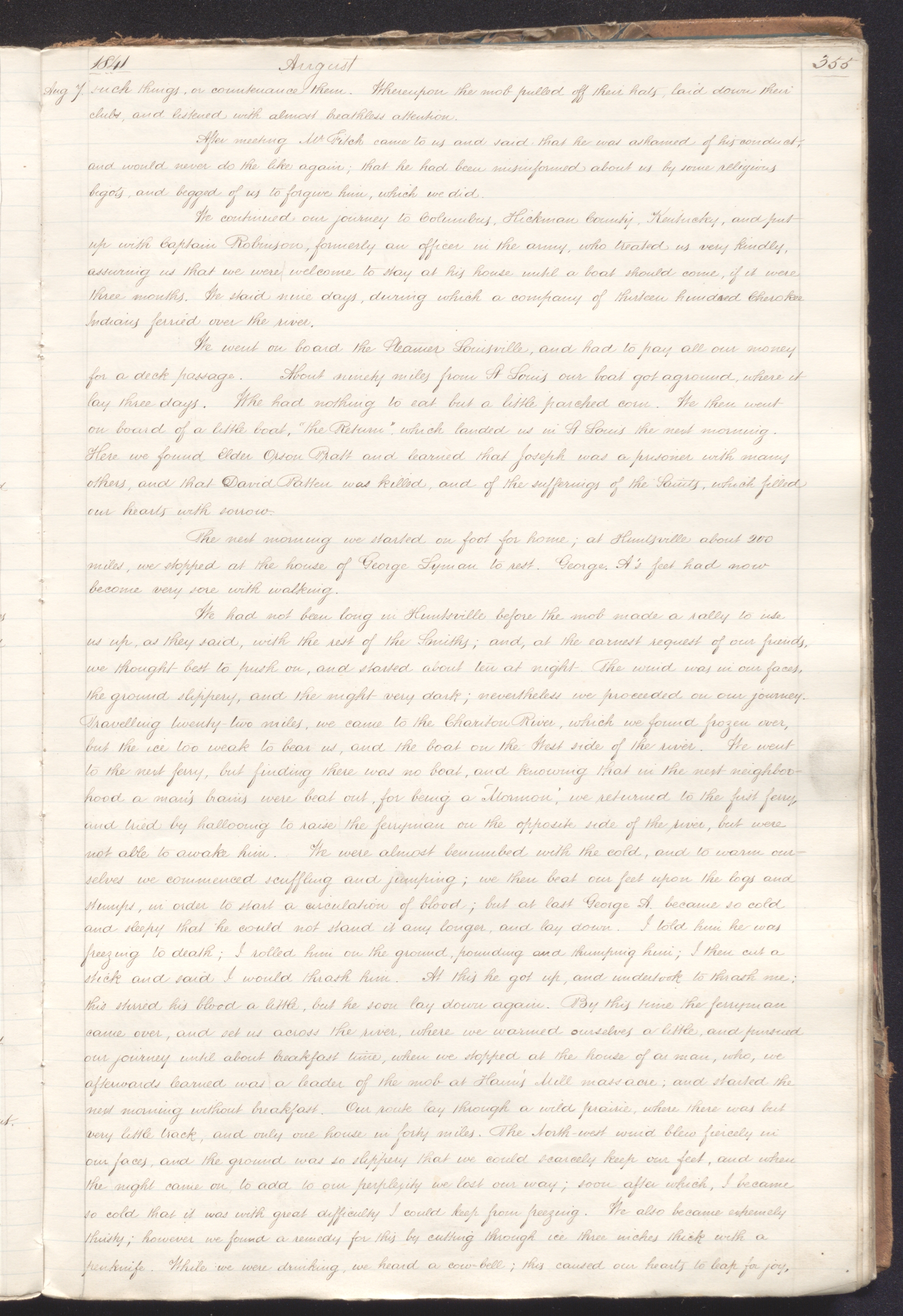 JS, History, 1838–1856, vol. C-2, created 2 Aug. 1845–3 Feb. 1846, 8 Nov. 1854–2 Oct. 1855, and 10 Mar. 1862; handwriting of , , , Jonathan Grimshaw, and Robert L. Campbell; 520 pages, plus eight pages of addenda; CHL. This is a copy of the third volume of a six-volume manuscript history of the church (JS History, 1838–1856, vol. C-1), and covers the period from 2 Nov. 1838 to 31 July 1842. The copy also comprises four other volumes, labeled A-2, B-2, D-2, and E-2, and continues through 19 July 1843. The copy was discontinued 6 Aug. 1856 “by the advice of President ” (JS History, 1838–1856, vol. E-2, p. 83).