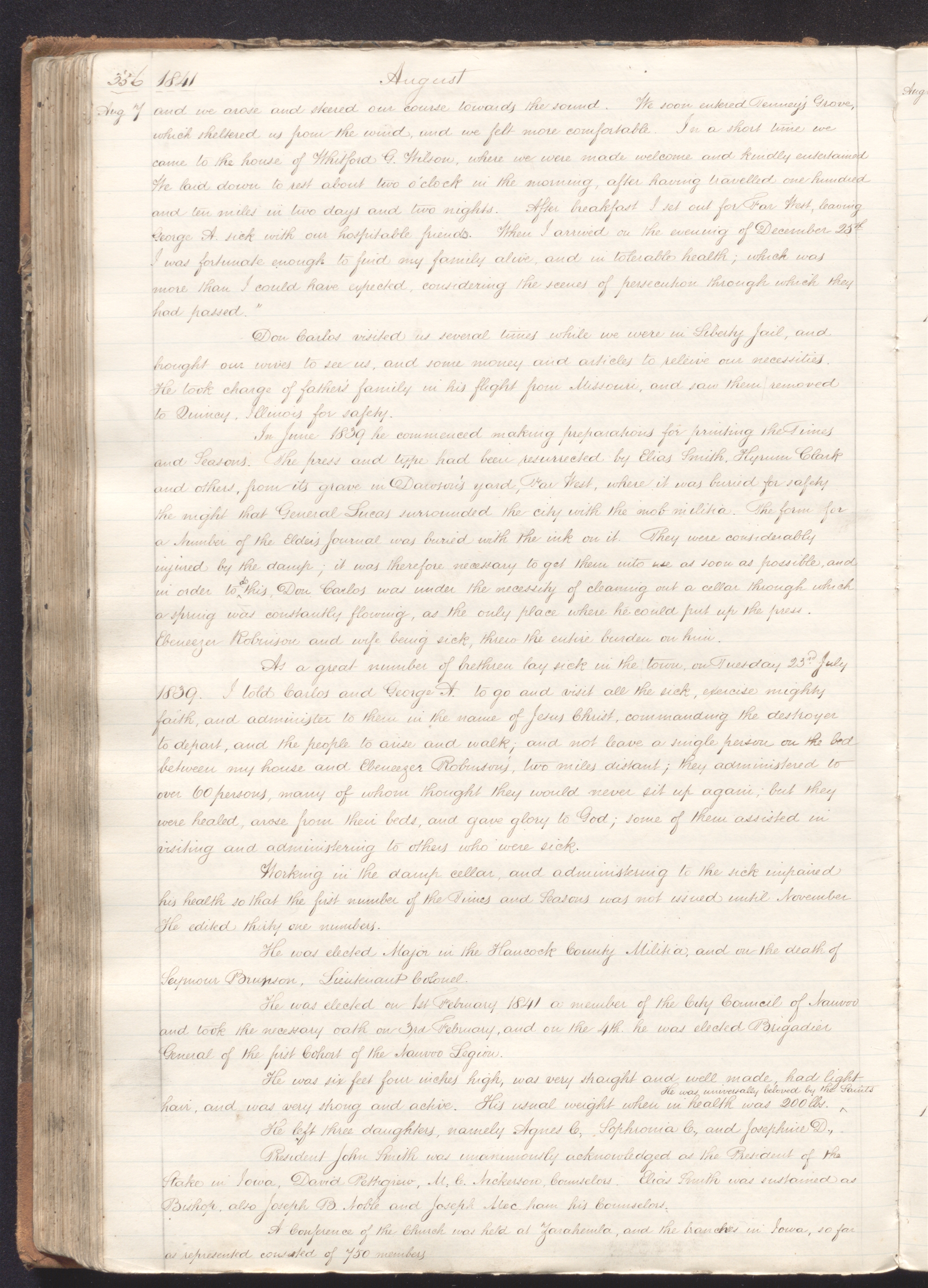 JS, History, 1838–1856, vol. C-2, created 2 Aug. 1845–3 Feb. 1846, 8 Nov. 1854–2 Oct. 1855, and 10 Mar. 1862; handwriting of , , , Jonathan Grimshaw, and Robert L. Campbell; 520 pages, plus eight pages of addenda; CHL. This is a copy of the third volume of a six-volume manuscript history of the church (JS History, 1838–1856, vol. C-1), and covers the period from 2 Nov. 1838 to 31 July 1842. The copy also comprises four other volumes, labeled A-2, B-2, D-2, and E-2, and continues through 19 July 1843. The copy was discontinued 6 Aug. 1856 “by the advice of President ” (JS History, 1838–1856, vol. E-2, p. 83).