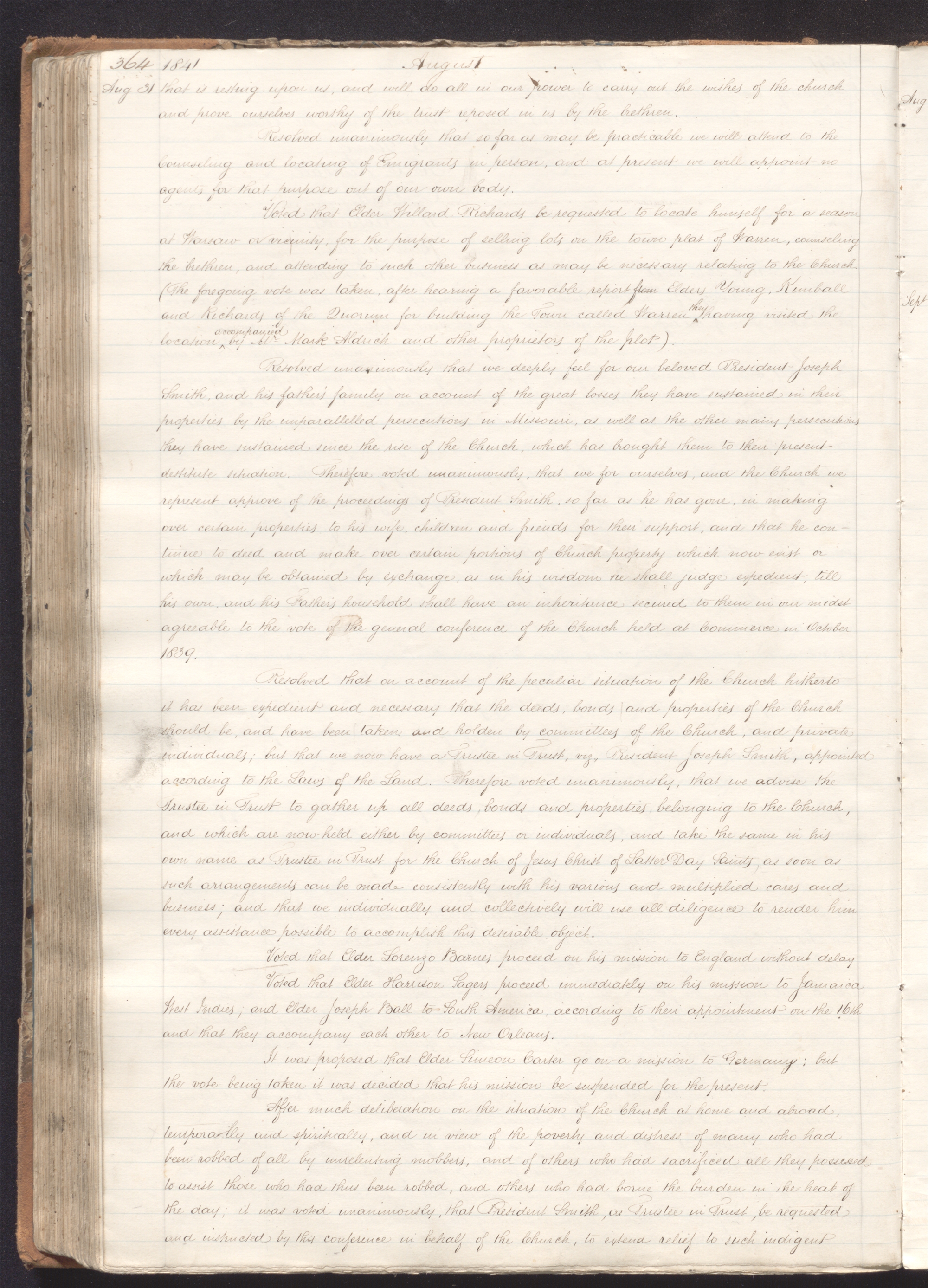 JS, History, 1838–1856, vol. C-2, created 2 Aug. 1845–3 Feb. 1846, 8 Nov. 1854–2 Oct. 1855, and 10 Mar. 1862; handwriting of , , , Jonathan Grimshaw, and Robert L. Campbell; 520 pages, plus eight pages of addenda; CHL. This is a copy of the third volume of a six-volume manuscript history of the church (JS History, 1838–1856, vol. C-1), and covers the period from 2 Nov. 1838 to 31 July 1842. The copy also comprises four other volumes, labeled A-2, B-2, D-2, and E-2, and continues through 19 July 1843. The copy was discontinued 6 Aug. 1856 “by the advice of President ” (JS History, 1838–1856, vol. E-2, p. 83).