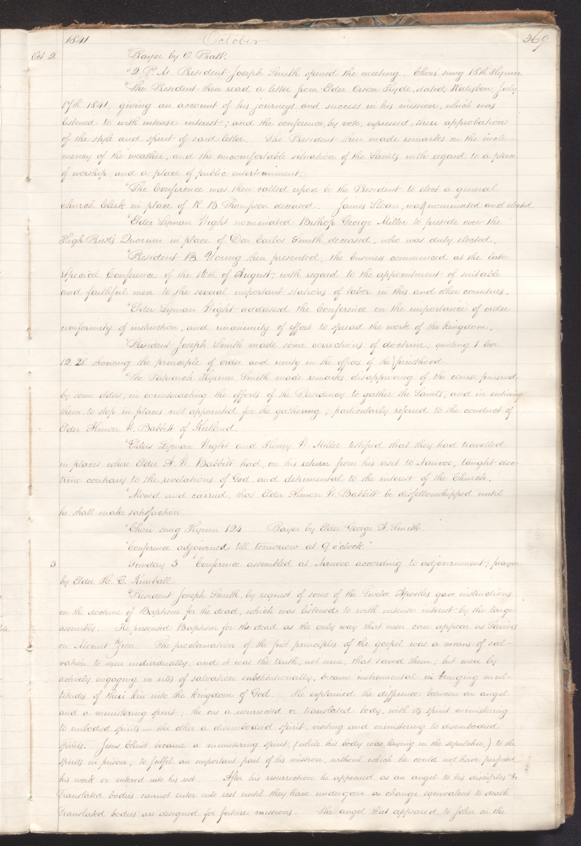 JS, History, 1838–1856, vol. C-2, created 2 Aug. 1845–3 Feb. 1846, 8 Nov. 1854–2 Oct. 1855, and 10 Mar. 1862; handwriting of , , , Jonathan Grimshaw, and Robert L. Campbell; 520 pages, plus eight pages of addenda; CHL. This is a copy of the third volume of a six-volume manuscript history of the church (JS History, 1838–1856, vol. C-1), and covers the period from 2 Nov. 1838 to 31 July 1842. The copy also comprises four other volumes, labeled A-2, B-2, D-2, and E-2, and continues through 19 July 1843. The copy was discontinued 6 Aug. 1856 “by the advice of President ” (JS History, 1838–1856, vol. E-2, p. 83).