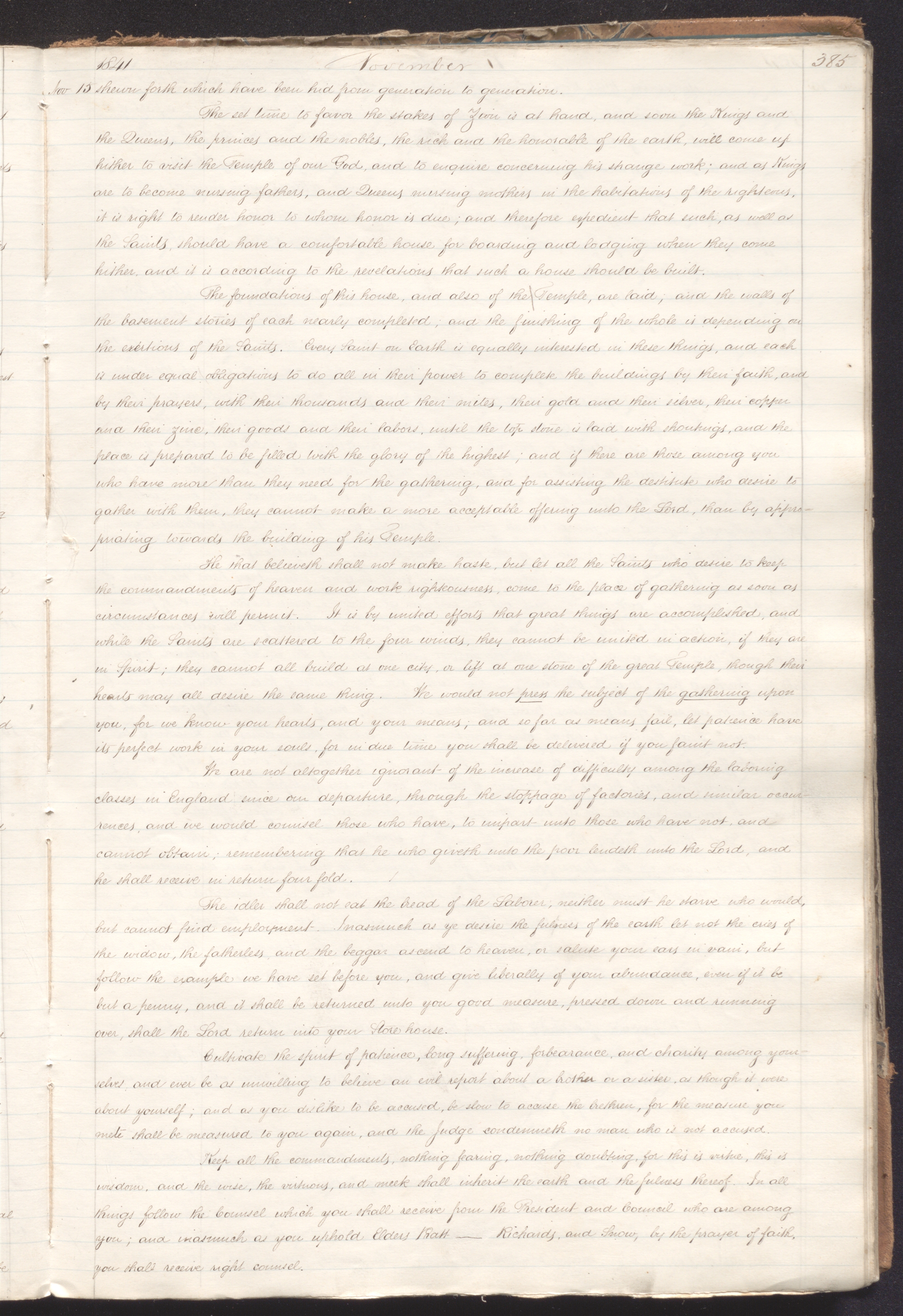 JS, History, 1838–1856, vol. C-2, created 2 Aug. 1845–3 Feb. 1846, 8 Nov. 1854–2 Oct. 1855, and 10 Mar. 1862; handwriting of , , , Jonathan Grimshaw, and Robert L. Campbell; 520 pages, plus eight pages of addenda; CHL. This is a copy of the third volume of a six-volume manuscript history of the church (JS History, 1838–1856, vol. C-1), and covers the period from 2 Nov. 1838 to 31 July 1842. The copy also comprises four other volumes, labeled A-2, B-2, D-2, and E-2, and continues through 19 July 1843. The copy was discontinued 6 Aug. 1856 “by the advice of President ” (JS History, 1838–1856, vol. E-2, p. 83).