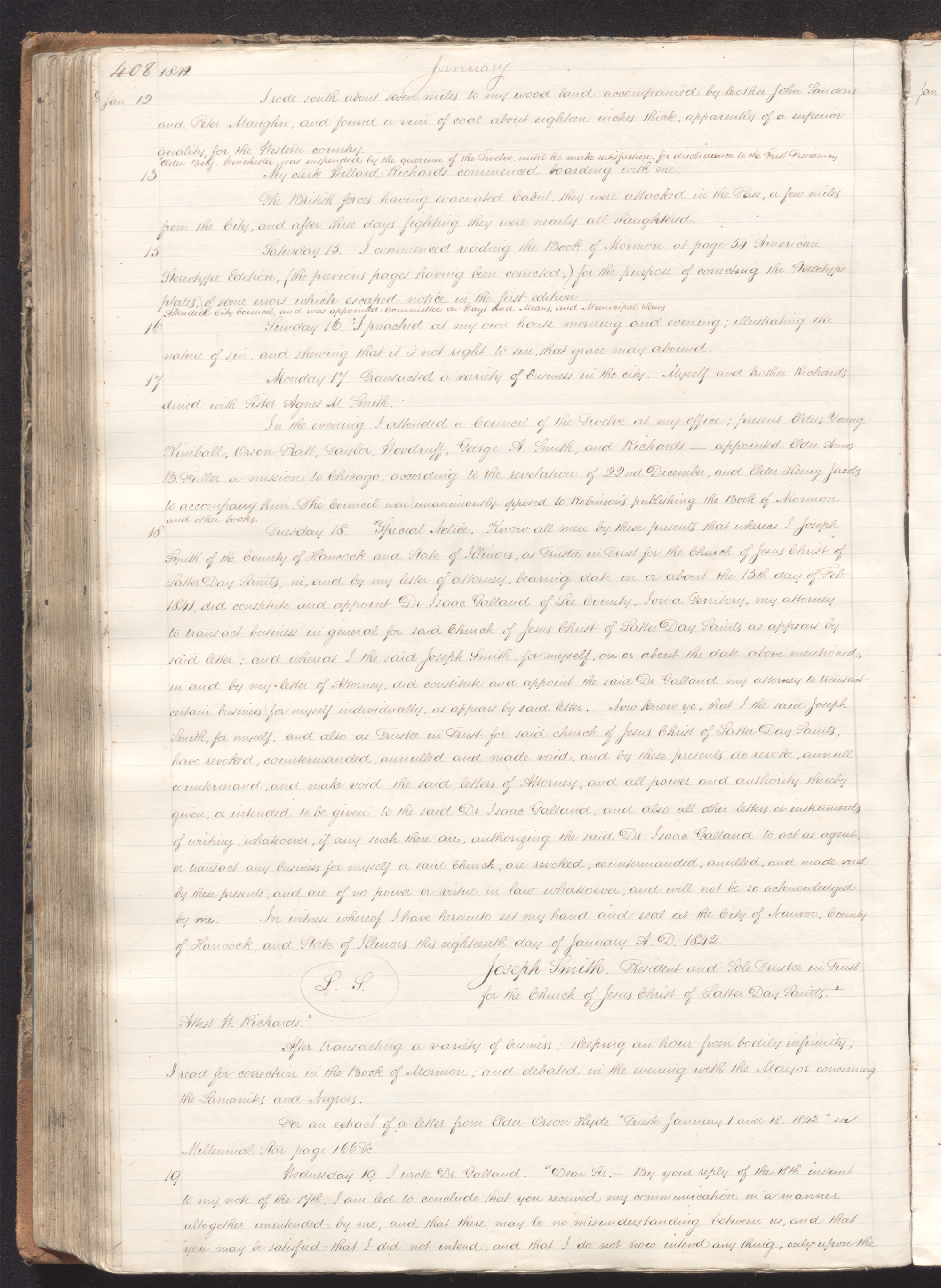JS, History, 1838–1856, vol. C-2, created 2 Aug. 1845–3 Feb. 1846, 8 Nov. 1854–2 Oct. 1855, and 10 Mar. 1862; handwriting of , , , Jonathan Grimshaw, and Robert L. Campbell; 520 pages, plus eight pages of addenda; CHL. This is a copy of the third volume of a six-volume manuscript history of the church (JS History, 1838–1856, vol. C-1), and covers the period from 2 Nov. 1838 to 31 July 1842. The copy also comprises four other volumes, labeled A-2, B-2, D-2, and E-2, and continues through 19 July 1843. The copy was discontinued 6 Aug. 1856 “by the advice of President ” (JS History, 1838–1856, vol. E-2, p. 83).