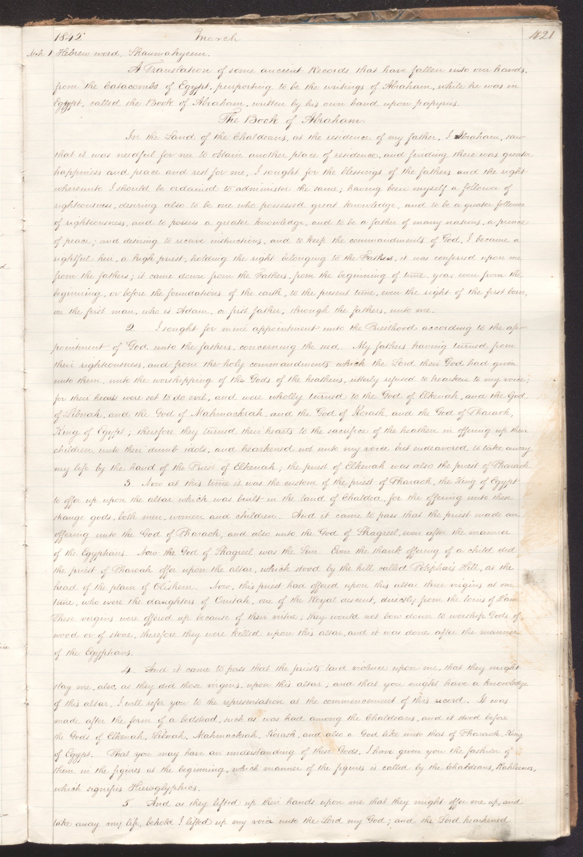 JS, History, 1838–1856, vol. C-2, created 2 Aug. 1845–3 Feb. 1846, 8 Nov. 1854–2 Oct. 1855, and 10 Mar. 1862; handwriting of , , , Jonathan Grimshaw, and Robert L. Campbell; 520 pages, plus eight pages of addenda; CHL. This is a copy of the third volume of a six-volume manuscript history of the church (JS History, 1838–1856, vol. C-1), and covers the period from 2 Nov. 1838 to 31 July 1842. The copy also comprises four other volumes, labeled A-2, B-2, D-2, and E-2, and continues through 19 July 1843. The copy was discontinued 6 Aug. 1856 “by the advice of President ” (JS History, 1838–1856, vol. E-2, p. 83).