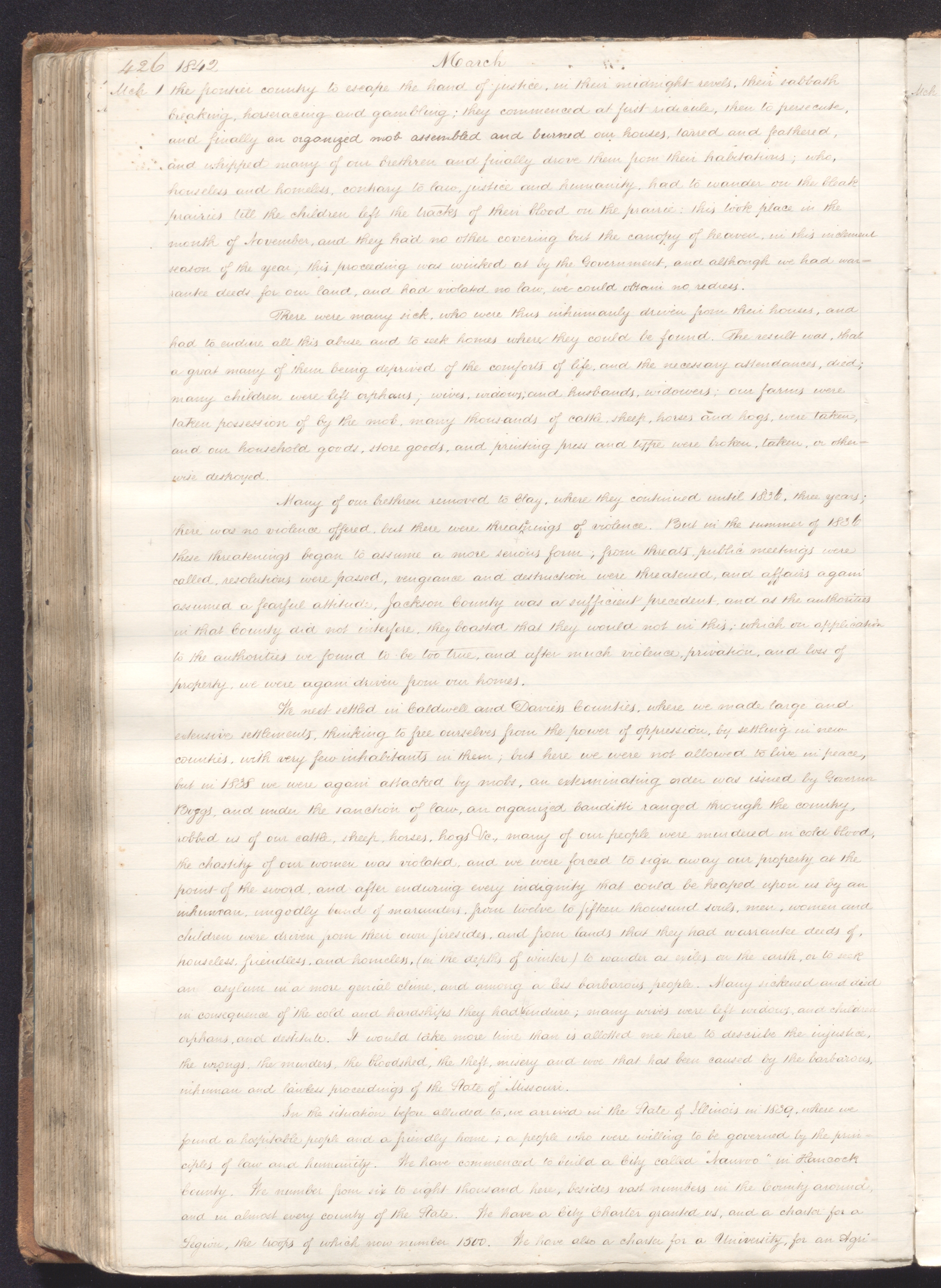 JS, History, 1838–1856, vol. C-2, created 2 Aug. 1845–3 Feb. 1846, 8 Nov. 1854–2 Oct. 1855, and 10 Mar. 1862; handwriting of , , , Jonathan Grimshaw, and Robert L. Campbell; 520 pages, plus eight pages of addenda; CHL. This is a copy of the third volume of a six-volume manuscript history of the church (JS History, 1838–1856, vol. C-1), and covers the period from 2 Nov. 1838 to 31 July 1842. The copy also comprises four other volumes, labeled A-2, B-2, D-2, and E-2, and continues through 19 July 1843. The copy was discontinued 6 Aug. 1856 “by the advice of President ” (JS History, 1838–1856, vol. E-2, p. 83).