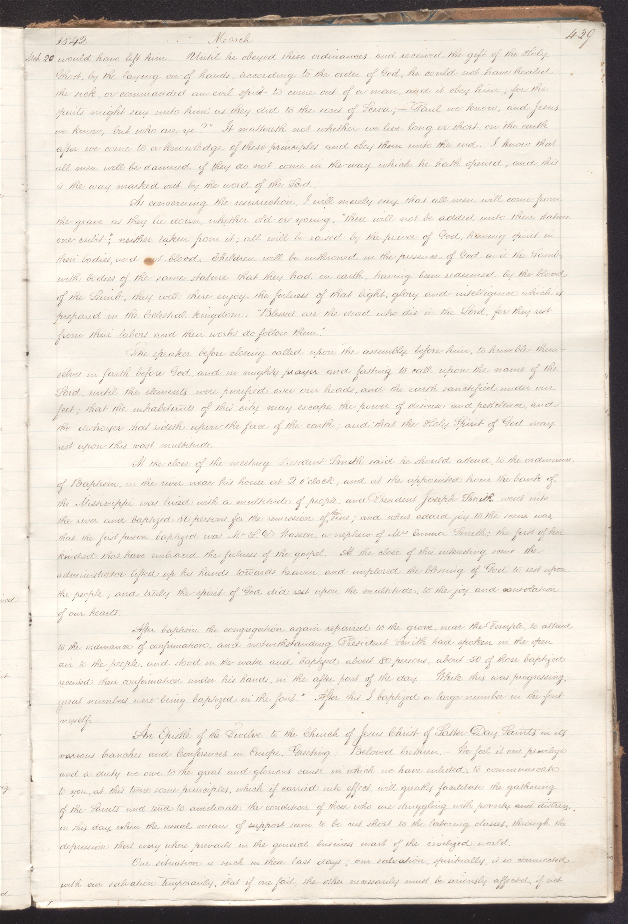 JS, History, 1838–1856, vol. C-2, created 2 Aug. 1845–3 Feb. 1846, 8 Nov. 1854–2 Oct. 1855, and 10 Mar. 1862; handwriting of , , , Jonathan Grimshaw, and Robert L. Campbell; 520 pages, plus eight pages of addenda; CHL. This is a copy of the third volume of a six-volume manuscript history of the church (JS History, 1838–1856, vol. C-1), and covers the period from 2 Nov. 1838 to 31 July 1842. The copy also comprises four other volumes, labeled A-2, B-2, D-2, and E-2, and continues through 19 July 1843. The copy was discontinued 6 Aug. 1856 “by the advice of President ” (JS History, 1838–1856, vol. E-2, p. 83).