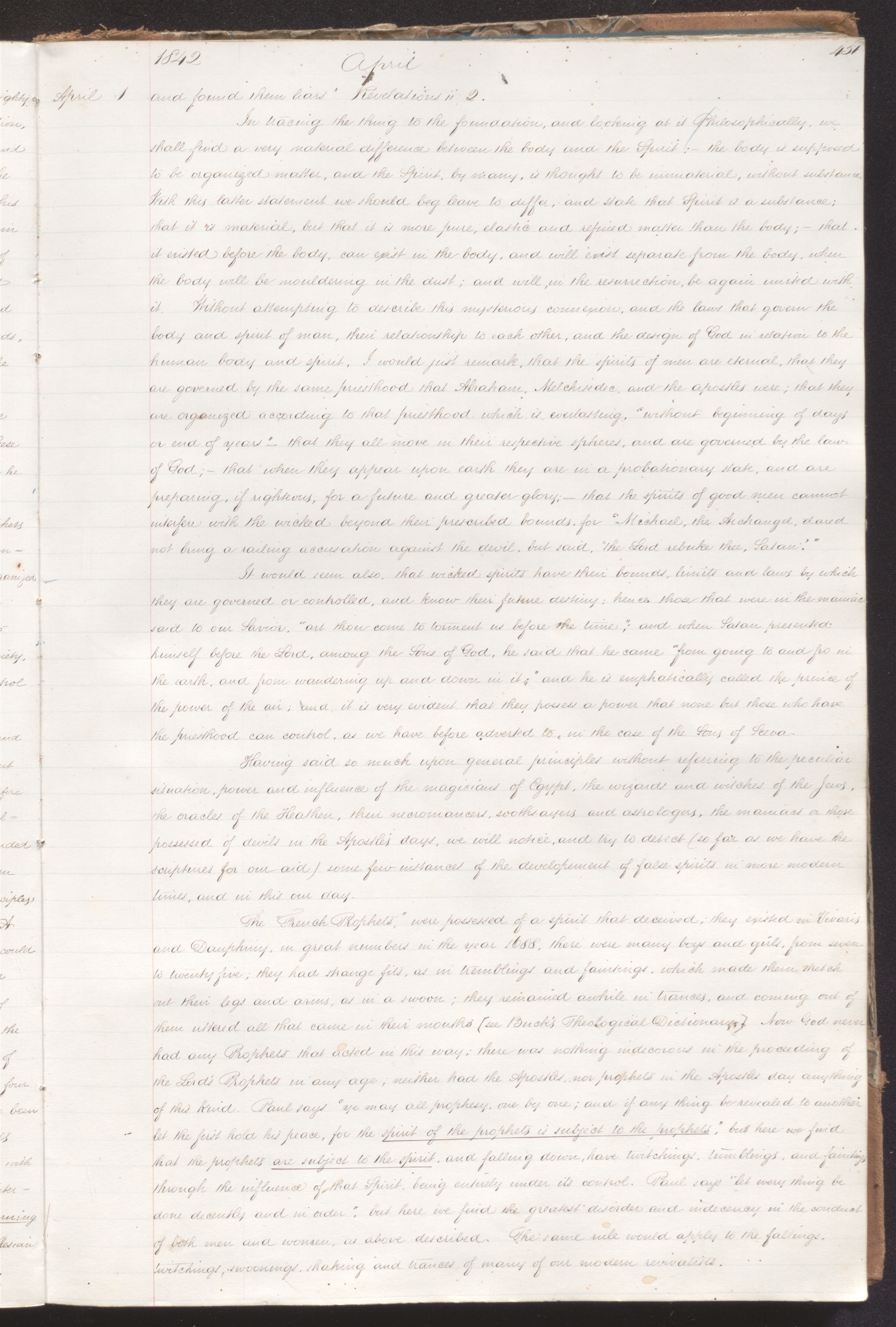 JS, History, 1838–1856, vol. C-2, created 2 Aug. 1845–3 Feb. 1846, 8 Nov. 1854–2 Oct. 1855, and 10 Mar. 1862; handwriting of , , , Jonathan Grimshaw, and Robert L. Campbell; 520 pages, plus eight pages of addenda; CHL. This is a copy of the third volume of a six-volume manuscript history of the church (JS History, 1838–1856, vol. C-1), and covers the period from 2 Nov. 1838 to 31 July 1842. The copy also comprises four other volumes, labeled A-2, B-2, D-2, and E-2, and continues through 19 July 1843. The copy was discontinued 6 Aug. 1856 “by the advice of President ” (JS History, 1838–1856, vol. E-2, p. 83).
