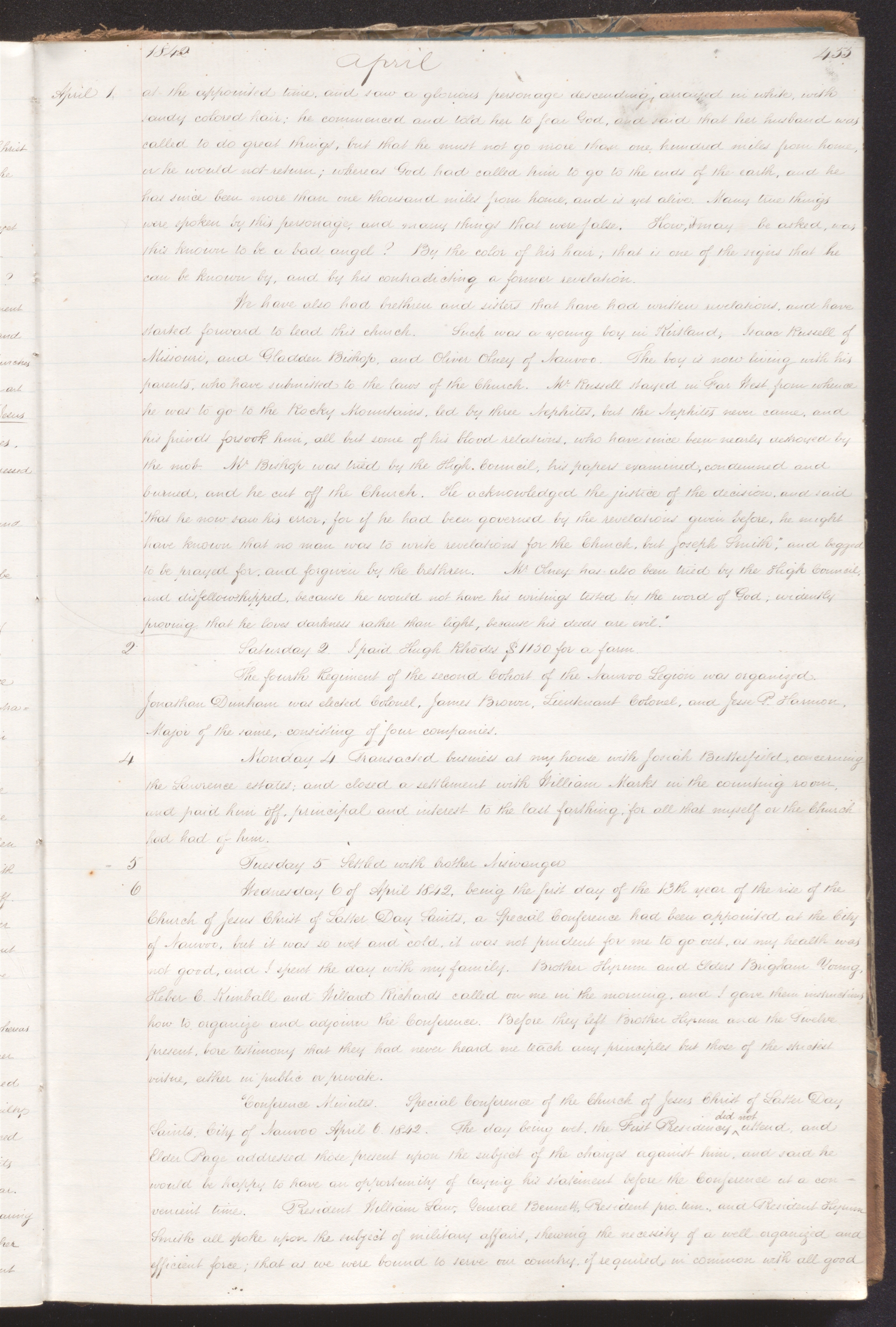 JS, History, 1838–1856, vol. C-2, created 2 Aug. 1845–3 Feb. 1846, 8 Nov. 1854–2 Oct. 1855, and 10 Mar. 1862; handwriting of , , , Jonathan Grimshaw, and Robert L. Campbell; 520 pages, plus eight pages of addenda; CHL. This is a copy of the third volume of a six-volume manuscript history of the church (JS History, 1838–1856, vol. C-1), and covers the period from 2 Nov. 1838 to 31 July 1842. The copy also comprises four other volumes, labeled A-2, B-2, D-2, and E-2, and continues through 19 July 1843. The copy was discontinued 6 Aug. 1856 “by the advice of President ” (JS History, 1838–1856, vol. E-2, p. 83).
