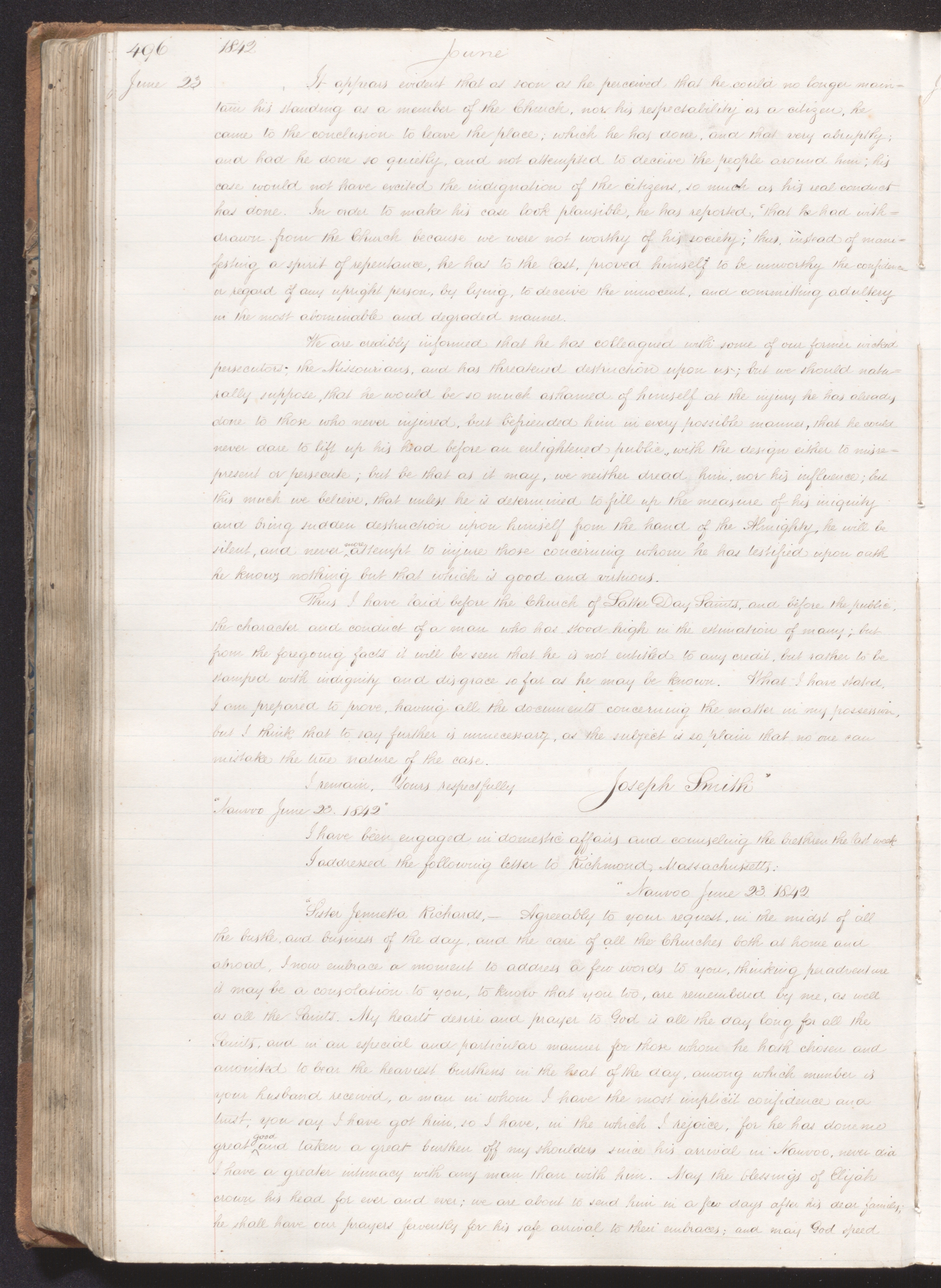 JS, History, 1838–1856, vol. C-2, created 2 Aug. 1845–3 Feb. 1846, 8 Nov. 1854–2 Oct. 1855, and 10 Mar. 1862; handwriting of , , , Jonathan Grimshaw, and Robert L. Campbell; 520 pages, plus eight pages of addenda; CHL. This is a copy of the third volume of a six-volume manuscript history of the church (JS History, 1838–1856, vol. C-1), and covers the period from 2 Nov. 1838 to 31 July 1842. The copy also comprises four other volumes, labeled A-2, B-2, D-2, and E-2, and continues through 19 July 1843. The copy was discontinued 6 Aug. 1856 “by the advice of President ” (JS History, 1838–1856, vol. E-2, p. 83).
