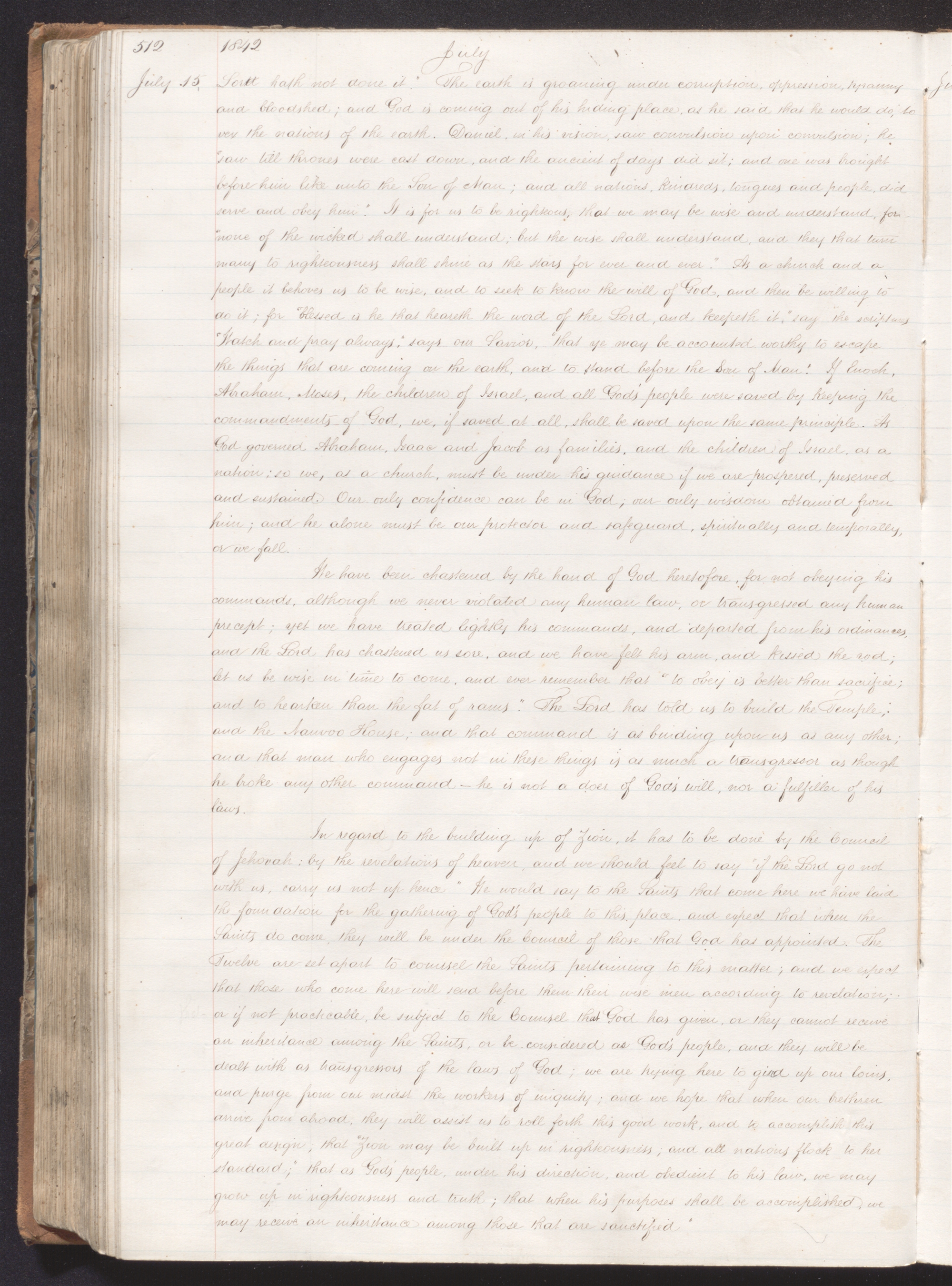 JS, History, 1838–1856, vol. C-2, created 2 Aug. 1845–3 Feb. 1846, 8 Nov. 1854–2 Oct. 1855, and 10 Mar. 1862; handwriting of , , , Jonathan Grimshaw, and Robert L. Campbell; 520 pages, plus eight pages of addenda; CHL. This is a copy of the third volume of a six-volume manuscript history of the church (JS History, 1838–1856, vol. C-1), and covers the period from 2 Nov. 1838 to 31 July 1842. The copy also comprises four other volumes, labeled A-2, B-2, D-2, and E-2, and continues through 19 July 1843. The copy was discontinued 6 Aug. 1856 “by the advice of President ” (JS History, 1838–1856, vol. E-2, p. 83).
