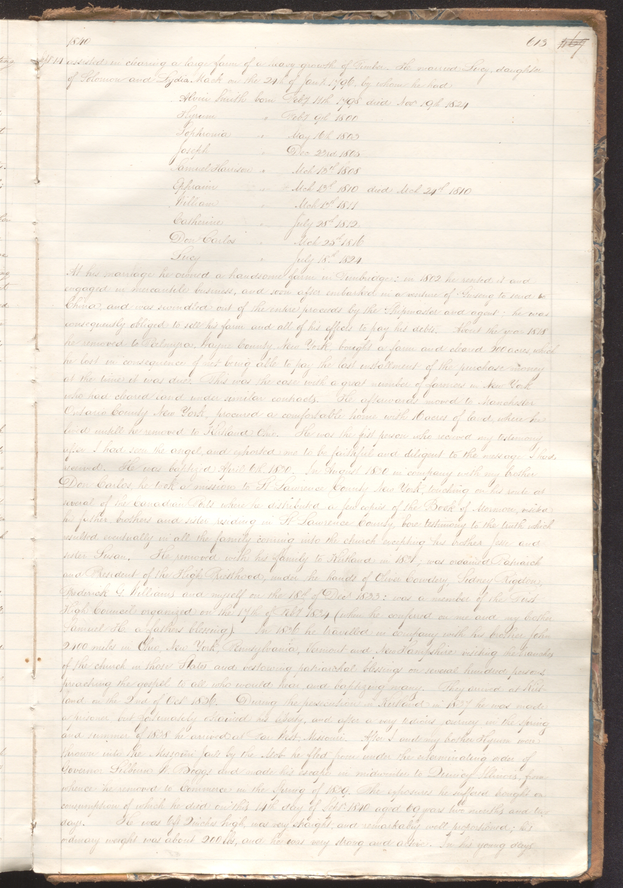 JS, History, 1838–1856, vol. C-2, created 2 Aug. 1845–3 Feb. 1846, 8 Nov. 1854–2 Oct. 1855, and 10 Mar. 1862; handwriting of , , , Jonathan Grimshaw, and Robert L. Campbell; 520 pages, plus eight pages of addenda; CHL. This is a copy of the third volume of a six-volume manuscript history of the church (JS History, 1838–1856, vol. C-1), and covers the period from 2 Nov. 1838 to 31 July 1842. The copy also comprises four other volumes, labeled A-2, B-2, D-2, and E-2, and continues through 19 July 1843. The copy was discontinued 6 Aug. 1856 “by the advice of President ” (JS History, 1838–1856, vol. E-2, p. 83).