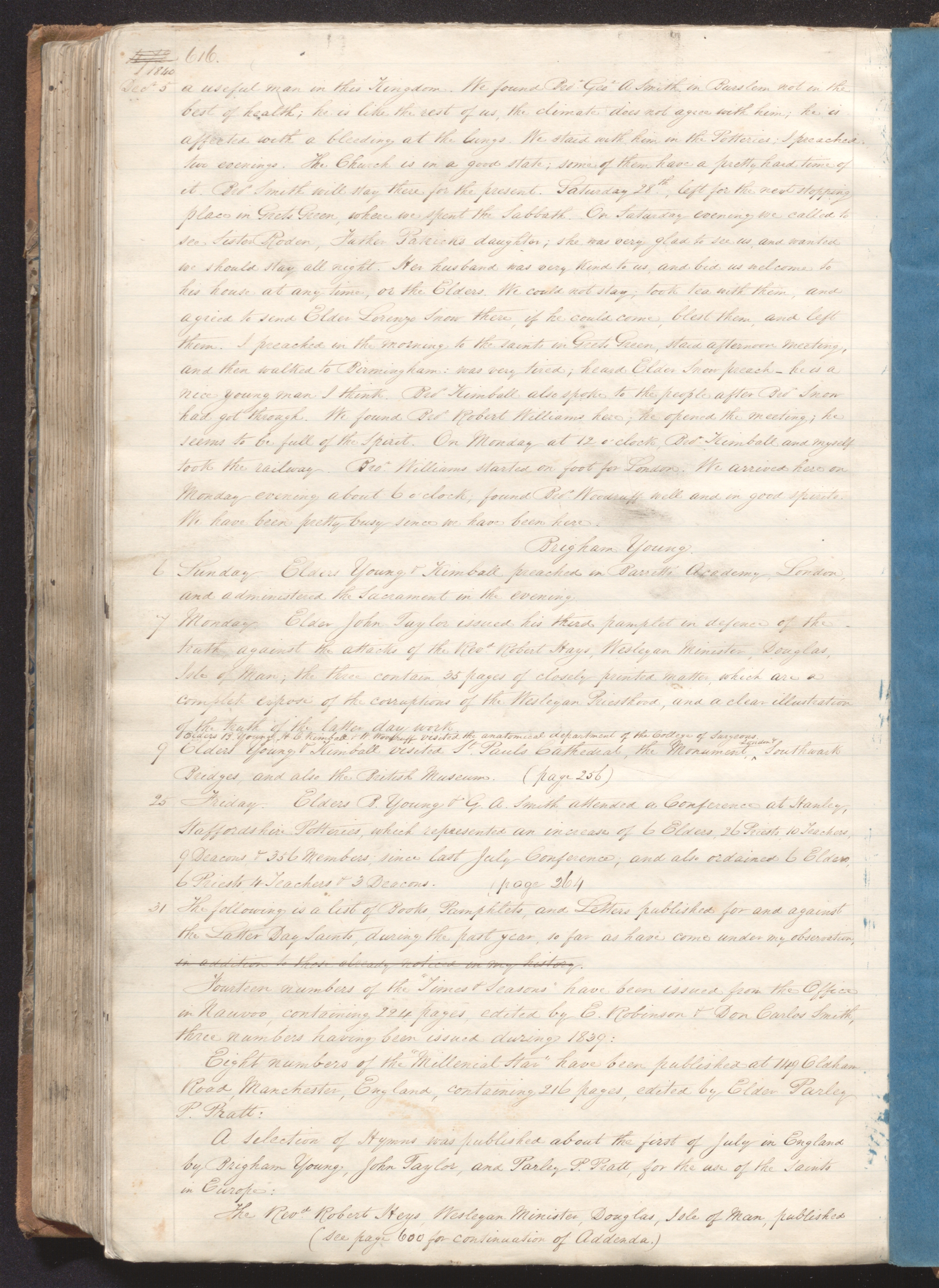 JS, History, 1838–1856, vol. C-2, created 2 Aug. 1845–3 Feb. 1846, 8 Nov. 1854–2 Oct. 1855, and 10 Mar. 1862; handwriting of , , , Jonathan Grimshaw, and Robert L. Campbell; 520 pages, plus eight pages of addenda; CHL. This is a copy of the third volume of a six-volume manuscript history of the church (JS History, 1838–1856, vol. C-1), and covers the period from 2 Nov. 1838 to 31 July 1842. The copy also comprises four other volumes, labeled A-2, B-2, D-2, and E-2, and continues through 19 July 1843. The copy was discontinued 6 Aug. 1856 “by the advice of President ” (JS History, 1838–1856, vol. E-2, p. 83).