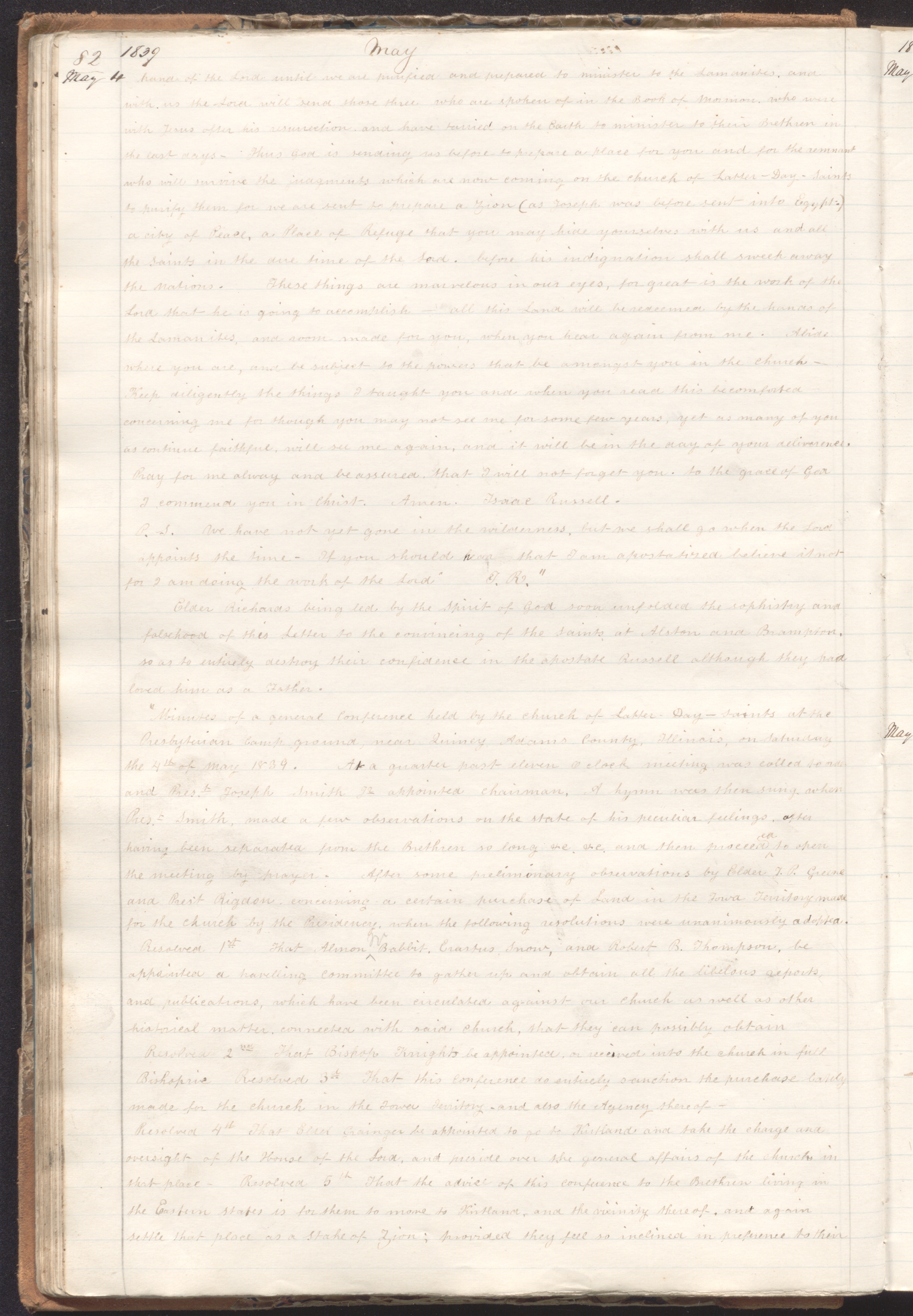 JS, History, 1838–1856, vol. C-2, created 2 Aug. 1845–3 Feb. 1846, 8 Nov. 1854–2 Oct. 1855, and 10 Mar. 1862; handwriting of , , , Jonathan Grimshaw, and Robert L. Campbell; 520 pages, plus eight pages of addenda; CHL. This is a copy of the third volume of a six-volume manuscript history of the church (JS History, 1838–1856, vol. C-1), and covers the period from 2 Nov. 1838 to 31 July 1842. The copy also comprises four other volumes, labeled A-2, B-2, D-2, and E-2, and continues through 19 July 1843. The copy was discontinued 6 Aug. 1856 “by the advice of President ” (JS History, 1838–1856, vol. E-2, p. 83).