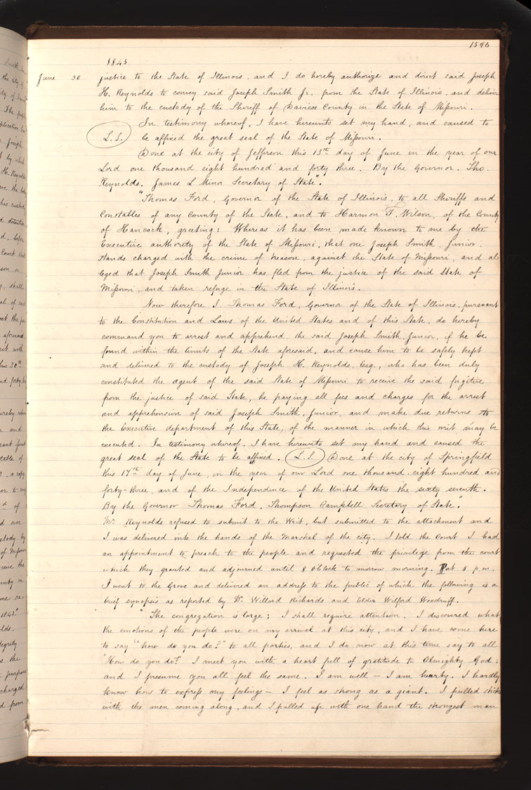 Now therefore I, , Governor of the State of , pursuant to the Constitution and Laws of the and of this , do hereby command you to arrest and apprehend the said Joseph Smith, Junior, if he be found within the limits of the aforesaid, and cause him to be safely kept and delivered to the custody of , Esq., who has been duly constituted the agent of the said State of to receive the said fugitive from the justice of said , he paying all fees and charges for the arrest and apprehension of said Joseph Smith, Junior, and make due returns to the Executive department of this , of the manner in which this writ may be executed. In testimony whereof, I have hereunto set my hand and caused the great seal of the to be affixed. L.S. Done at the city of this 17th. day of June, in the year of our Lord one thousand, eight hundred and forty-three, and of the Independence of the the sixty seventh. By the Governor , Thompson Campbell Secretary of State.”
