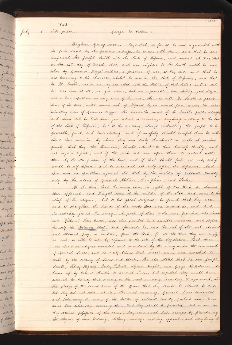 History, 1838–1856, volume D-1, constitutes the fourth of six volumes documenting the life of Joseph Smith and the early years of the Church of Jesus Christ of Latter-day Saints. The series is also known as the Manuscript History of the Church and was originally published serially from 1842 to 1846 and 1851 to 1858 as the “History of Joseph Smith” in the Times and Seasons and Deseret News. This volume contains JS’s history from 1 August 1842 to 1 July 1843, and it was compiled after JS’s death.