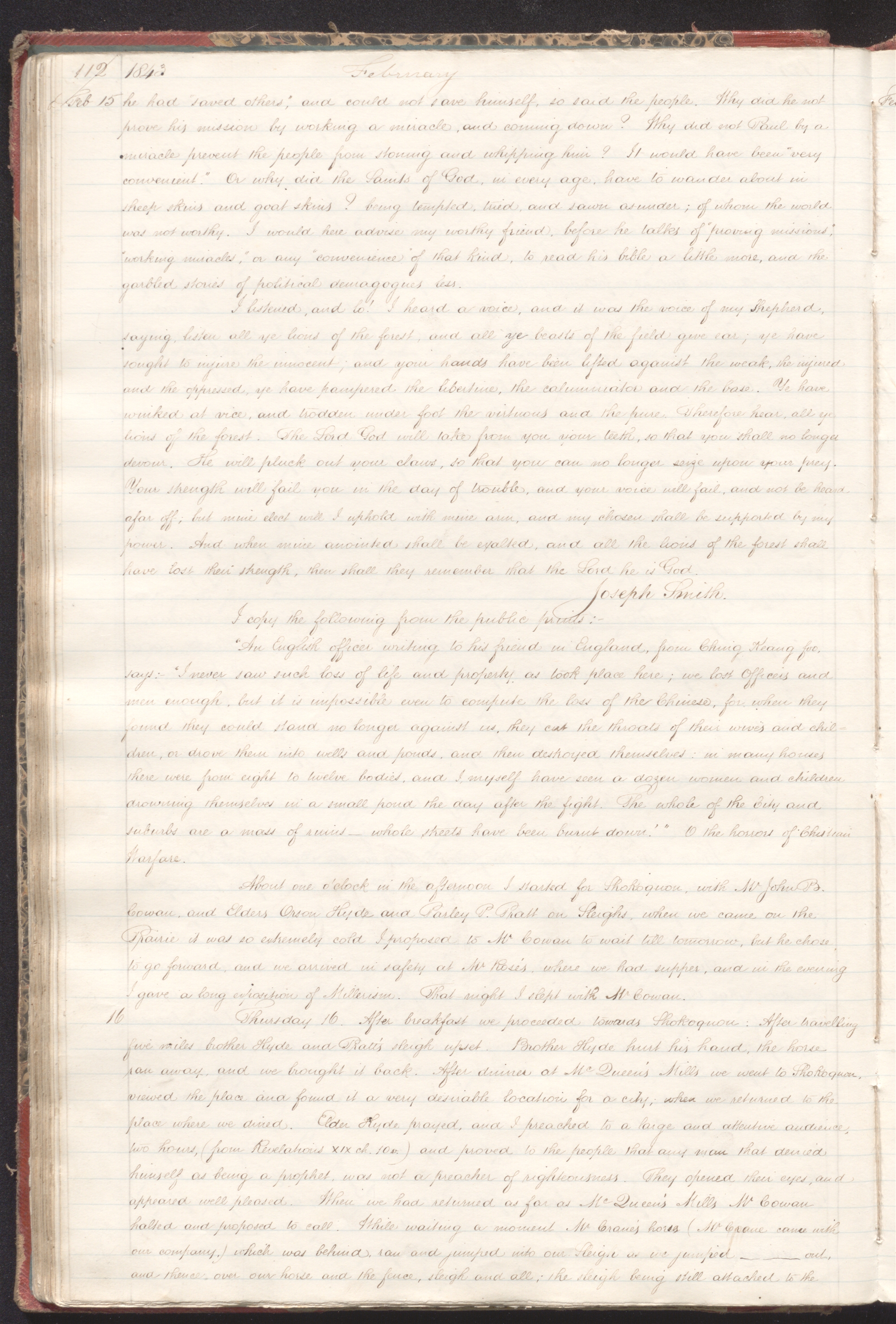 JS, History, 1838–1856, vol. D-2, created ca. 24 Nov. 1845–2 Feb. 1846, 17 Oct. 1855–11 July 1856, and 1 June 1866; handwriting of , , , and Joseph F. Smith; 248 pages, plus nine pages of addenda; CHL. This is a copy of the fourth volume of a six-volume manuscript history of the church (JS History, 1838–1856, vol. D-1), and covers the period from 1 Aug. 1842 to 30 June 1843. The copy also comprises four other volumes, labeled A-2, B-2, C-2, and E-2, and continues through 19 July 1843. The copy was discontinued 6 Aug. 1856 “by the advice of President ” (JS History, 1838–1856, vol. E-2, p. 83).