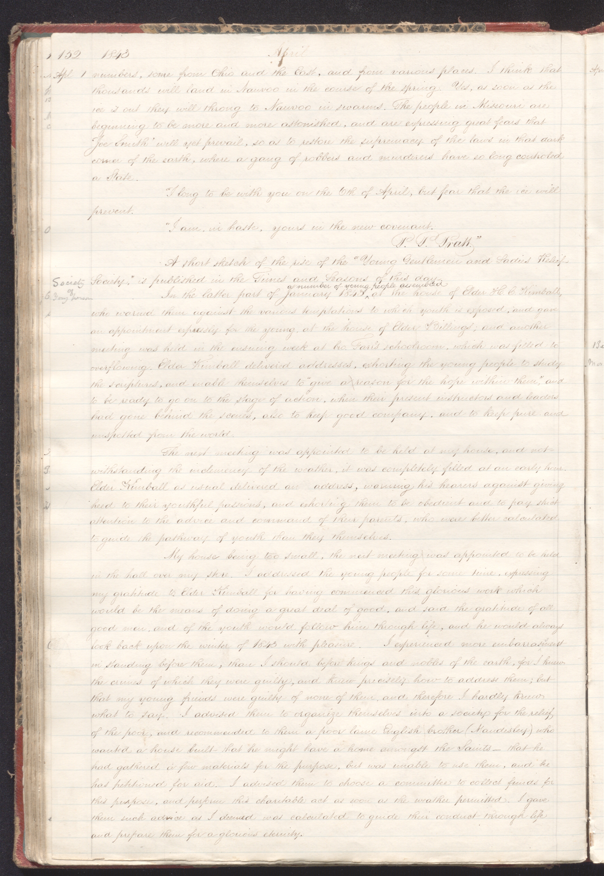 JS, History, 1838–1856, vol. D-2, created ca. 24 Nov. 1845–2 Feb. 1846, 17 Oct. 1855–11 July 1856, and 1 June 1866; handwriting of , , , and Joseph F. Smith; 248 pages, plus nine pages of addenda; CHL. This is a copy of the fourth volume of a six-volume manuscript history of the church (JS History, 1838–1856, vol. D-1), and covers the period from 1 Aug. 1842 to 30 June 1843. The copy also comprises four other volumes, labeled A-2, B-2, C-2, and E-2, and continues through 19 July 1843. The copy was discontinued 6 Aug. 1856 “by the advice of President ” (JS History, 1838–1856, vol. E-2, p. 83).