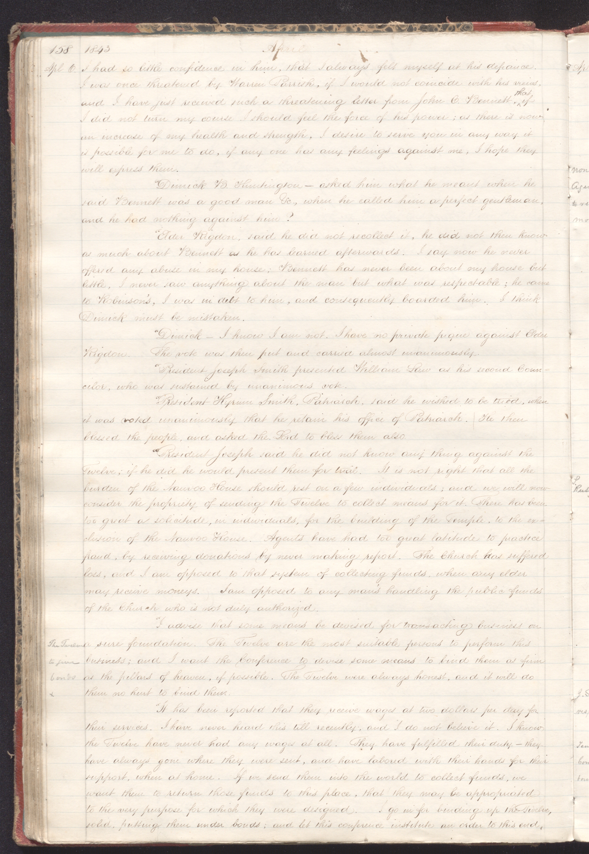 JS, History, 1838–1856, vol. D-2, created ca. 24 Nov. 1845–2 Feb. 1846, 17 Oct. 1855–11 July 1856, and 1 June 1866; handwriting of , , , and Joseph F. Smith; 248 pages, plus nine pages of addenda; CHL. This is a copy of the fourth volume of a six-volume manuscript history of the church (JS History, 1838–1856, vol. D-1), and covers the period from 1 Aug. 1842 to 30 June 1843. The copy also comprises four other volumes, labeled A-2, B-2, C-2, and E-2, and continues through 19 July 1843. The copy was discontinued 6 Aug. 1856 “by the advice of President ” (JS History, 1838–1856, vol. E-2, p. 83).