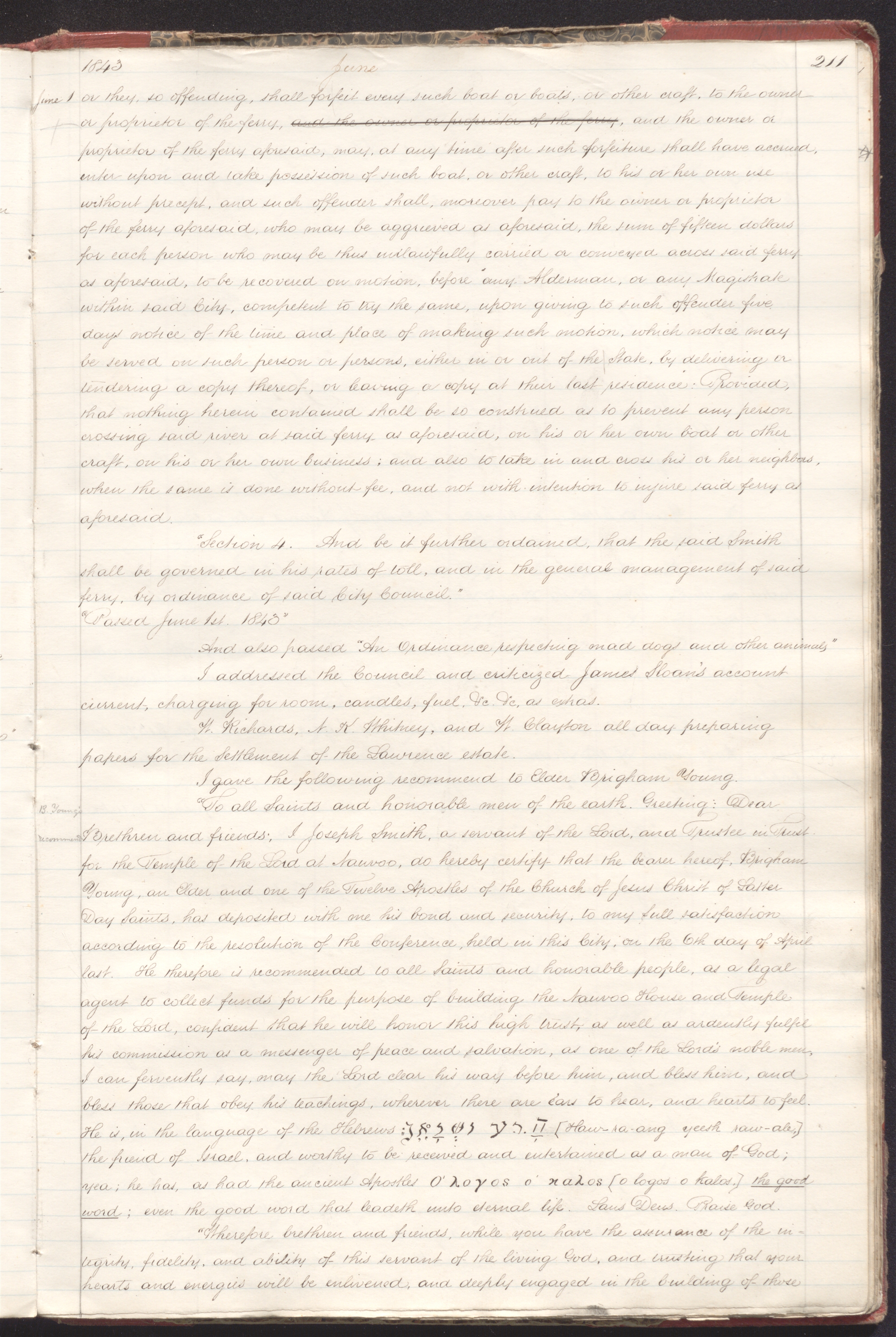 JS, History, 1838–1856, vol. D-2, created ca. 24 Nov. 1845–2 Feb. 1846, 17 Oct. 1855–11 July 1856, and 1 June 1866; handwriting of , , , and Joseph F. Smith; 248 pages, plus nine pages of addenda; CHL. This is a copy of the fourth volume of a six-volume manuscript history of the church (JS History, 1838–1856, vol. D-1), and covers the period from 1 Aug. 1842 to 30 June 1843. The copy also comprises four other volumes, labeled A-2, B-2, C-2, and E-2, and continues through 19 July 1843. The copy was discontinued 6 Aug. 1856 “by the advice of President ” (JS History, 1838–1856, vol. E-2, p. 83).