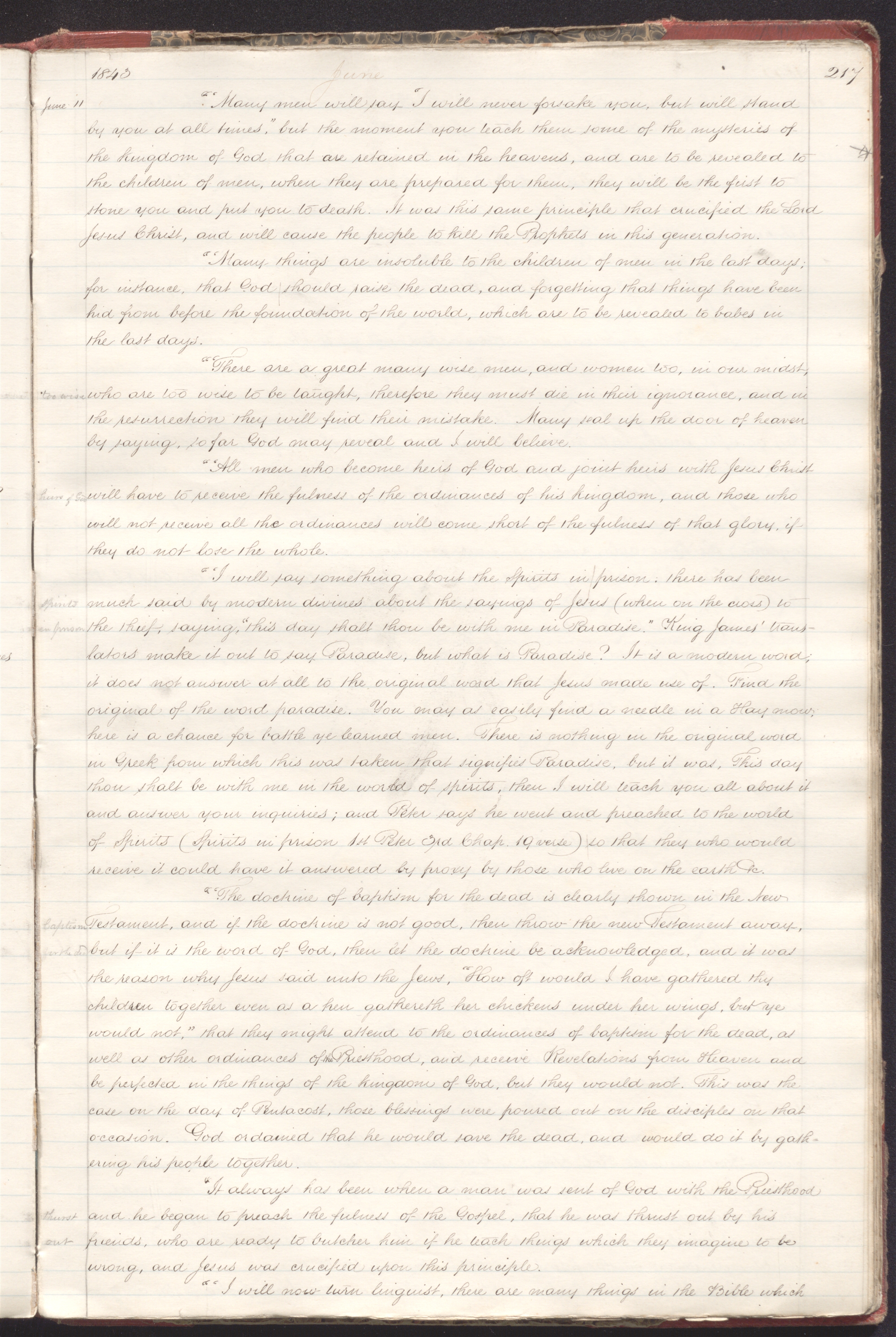 JS, History, 1838–1856, vol. D-2, created ca. 24 Nov. 1845–2 Feb. 1846, 17 Oct. 1855–11 July 1856, and 1 June 1866; handwriting of , , , and Joseph F. Smith; 248 pages, plus nine pages of addenda; CHL. This is a copy of the fourth volume of a six-volume manuscript history of the church (JS History, 1838–1856, vol. D-1), and covers the period from 1 Aug. 1842 to 30 June 1843. The copy also comprises four other volumes, labeled A-2, B-2, C-2, and E-2, and continues through 19 July 1843. The copy was discontinued 6 Aug. 1856 “by the advice of President ” (JS History, 1838–1856, vol. E-2, p. 83).