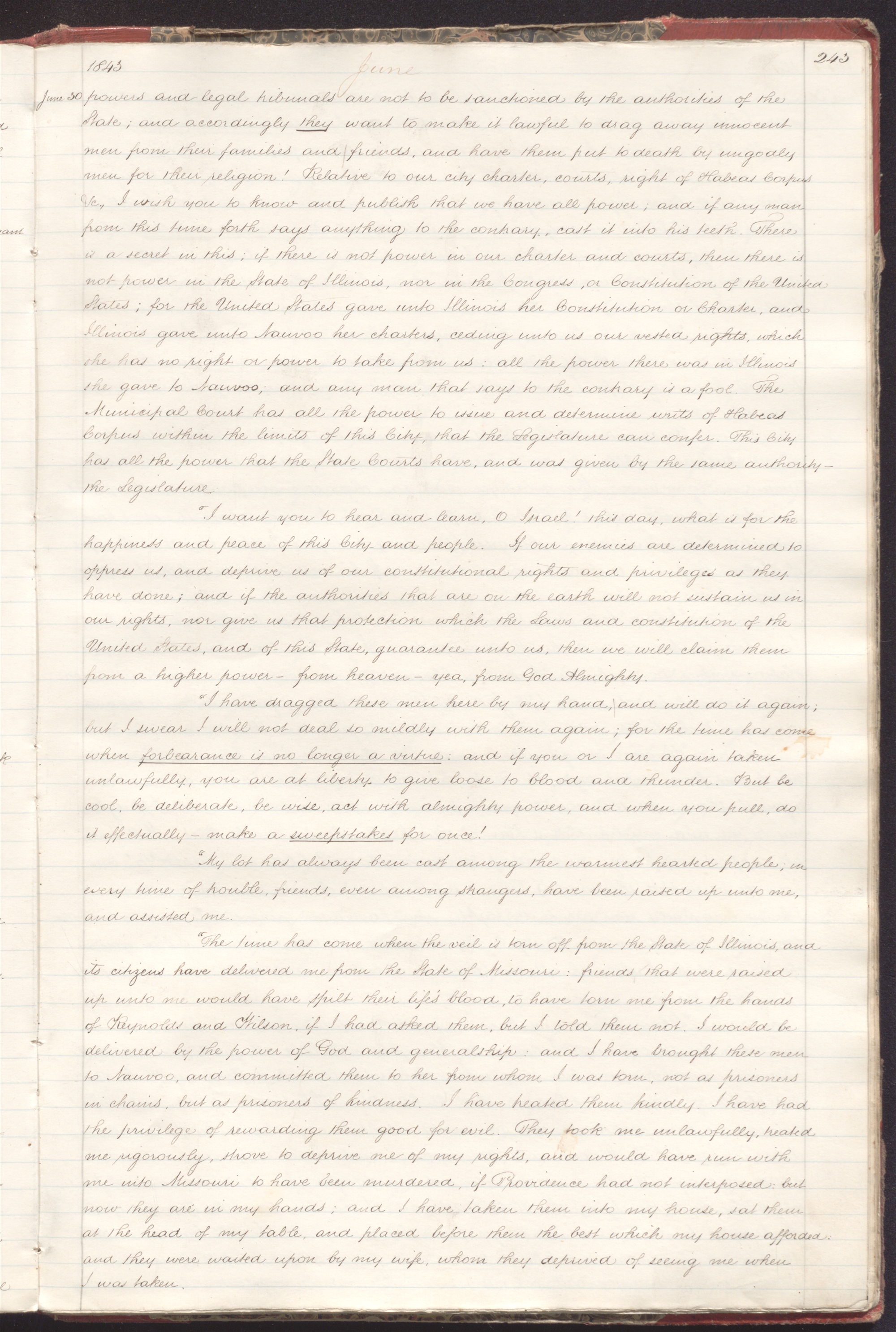 JS, History, 1838–1856, vol. D-2, created ca. 24 Nov. 1845–2 Feb. 1846, 17 Oct. 1855–11 July 1856, and 1 June 1866; handwriting of , , , and Joseph F. Smith; 248 pages, plus nine pages of addenda; CHL. This is a copy of the fourth volume of a six-volume manuscript history of the church (JS History, 1838–1856, vol. D-1), and covers the period from 1 Aug. 1842 to 30 June 1843. The copy also comprises four other volumes, labeled A-2, B-2, C-2, and E-2, and continues through 19 July 1843. The copy was discontinued 6 Aug. 1856 “by the advice of President ” (JS History, 1838–1856, vol. E-2, p. 83).