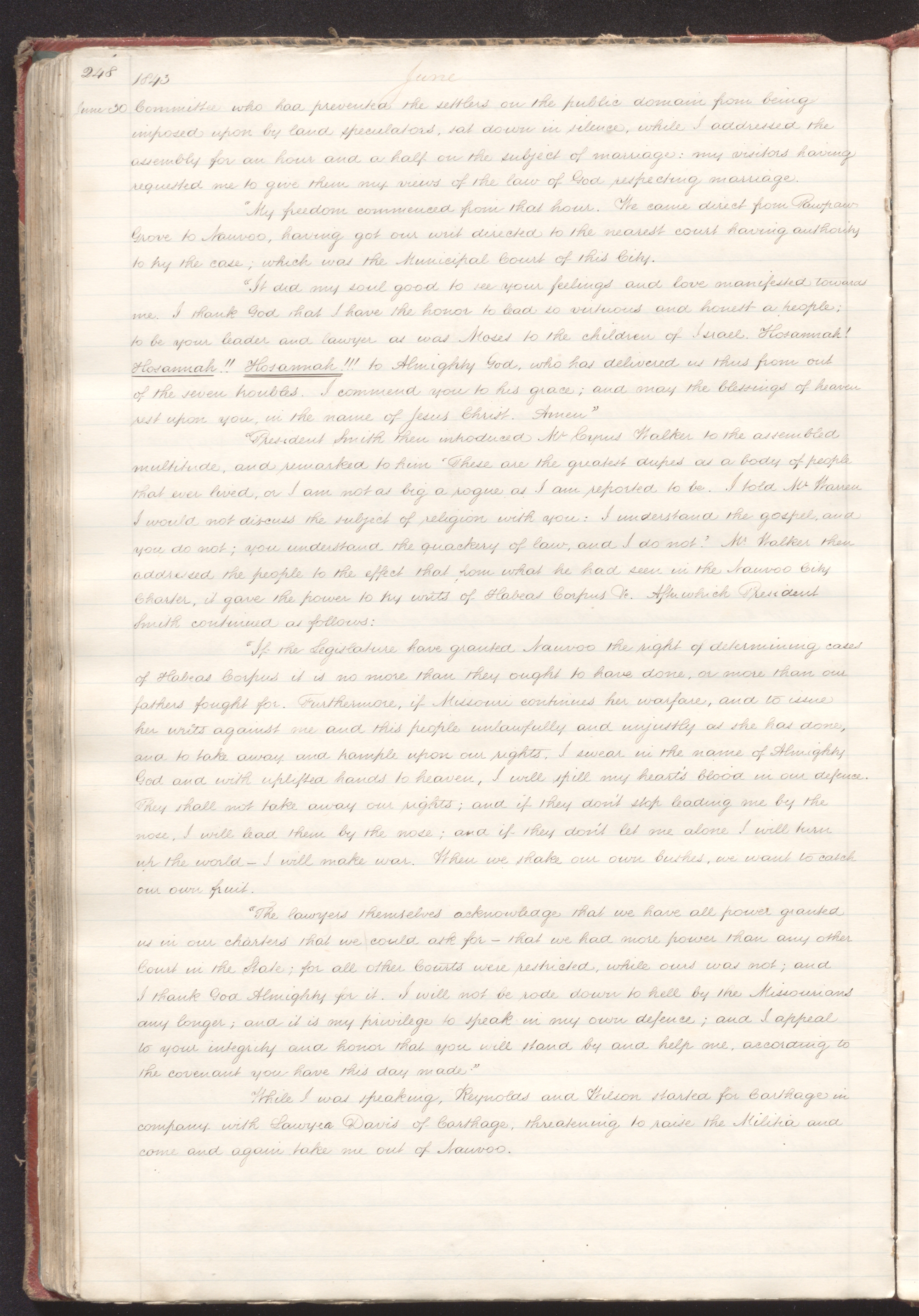 JS, History, 1838–1856, vol. D-2, created ca. 24 Nov. 1845–2 Feb. 1846, 17 Oct. 1855–11 July 1856, and 1 June 1866; handwriting of , , , and Joseph F. Smith; 248 pages, plus nine pages of addenda; CHL. This is a copy of the fourth volume of a six-volume manuscript history of the church (JS History, 1838–1856, vol. D-1), and covers the period from 1 Aug. 1842 to 30 June 1843. The copy also comprises four other volumes, labeled A-2, B-2, C-2, and E-2, and continues through 19 July 1843. The copy was discontinued 6 Aug. 1856 “by the advice of President ” (JS History, 1838–1856, vol. E-2, p. 83).