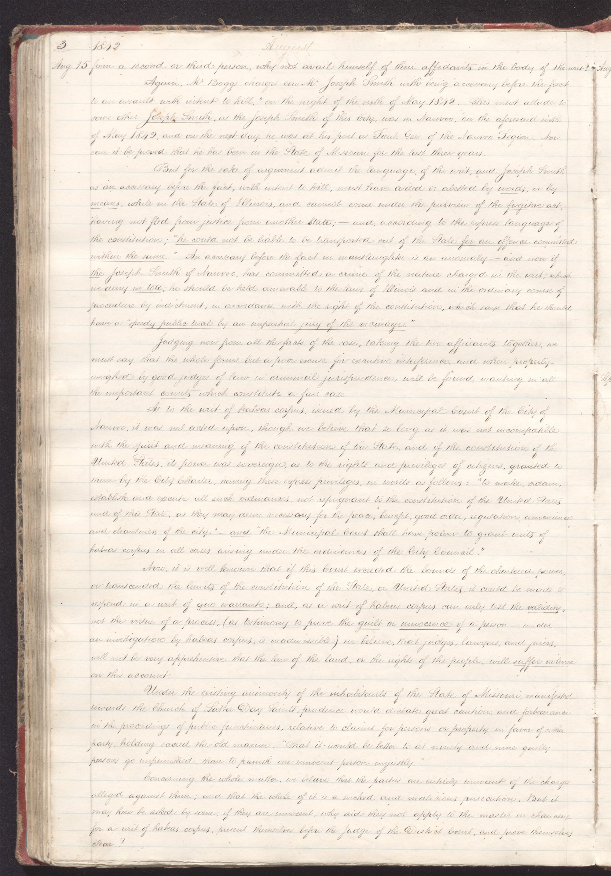 JS, History, 1838–1856, vol. D-2, created ca. 24 Nov. 1845–2 Feb. 1846, 17 Oct. 1855–11 July 1856, and 1 June 1866; handwriting of , , , and Joseph F. Smith; 248 pages, plus nine pages of addenda; CHL. This is a copy of the fourth volume of a six-volume manuscript history of the church (JS History, 1838–1856, vol. D-1), and covers the period from 1 Aug. 1842 to 30 June 1843. The copy also comprises four other volumes, labeled A-2, B-2, C-2, and E-2, and continues through 19 July 1843. The copy was discontinued 6 Aug. 1856 “by the advice of President ” (JS History, 1838–1856, vol. E-2, p. 83).