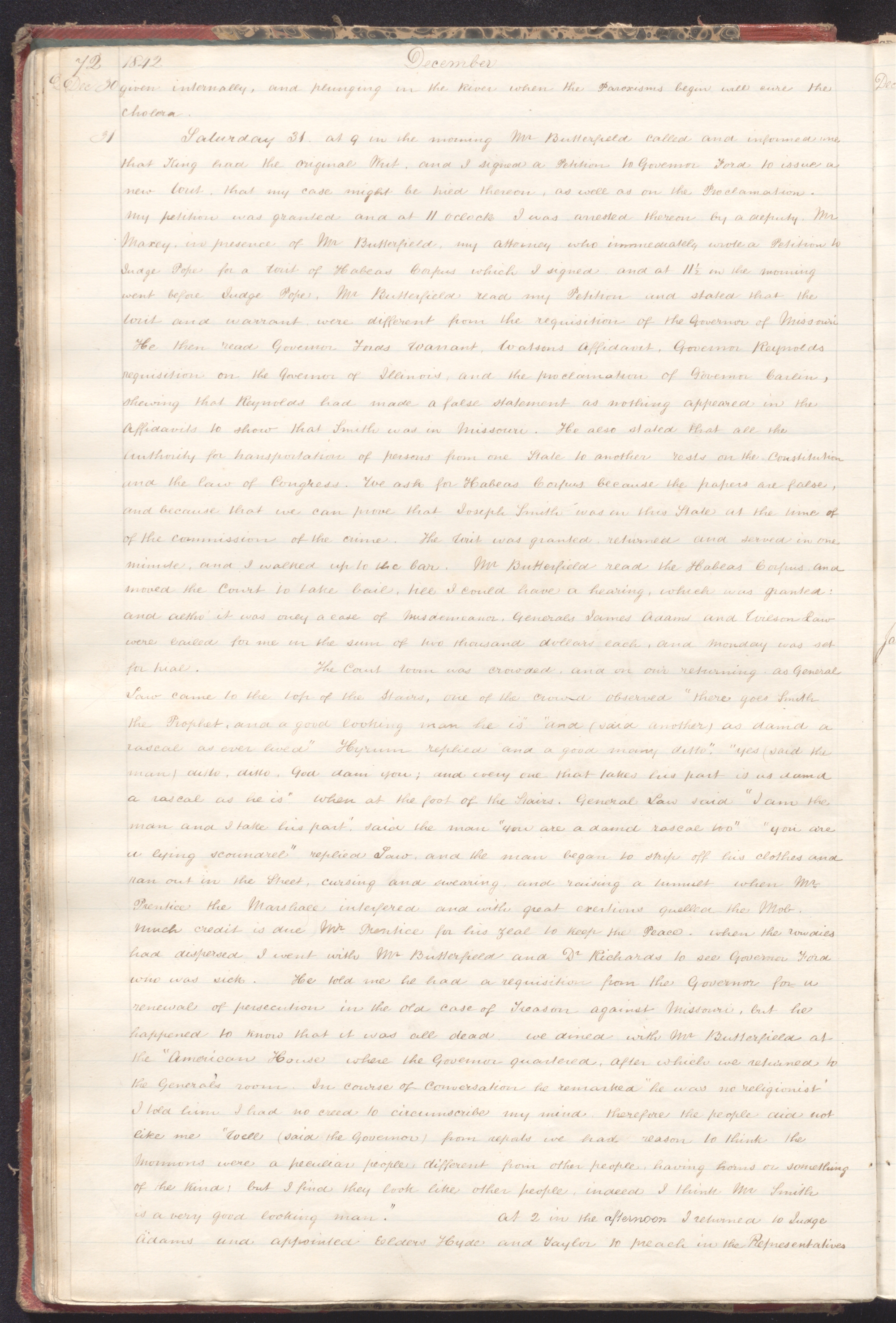 JS, History, 1838–1856, vol. D-2, created ca. 24 Nov. 1845–2 Feb. 1846, 17 Oct. 1855–11 July 1856, and 1 June 1866; handwriting of , , , and Joseph F. Smith; 248 pages, plus nine pages of addenda; CHL. This is a copy of the fourth volume of a six-volume manuscript history of the church (JS History, 1838–1856, vol. D-1), and covers the period from 1 Aug. 1842 to 30 June 1843. The copy also comprises four other volumes, labeled A-2, B-2, C-2, and E-2, and continues through 19 July 1843. The copy was discontinued 6 Aug. 1856 “by the advice of President ” (JS History, 1838–1856, vol. E-2, p. 83).