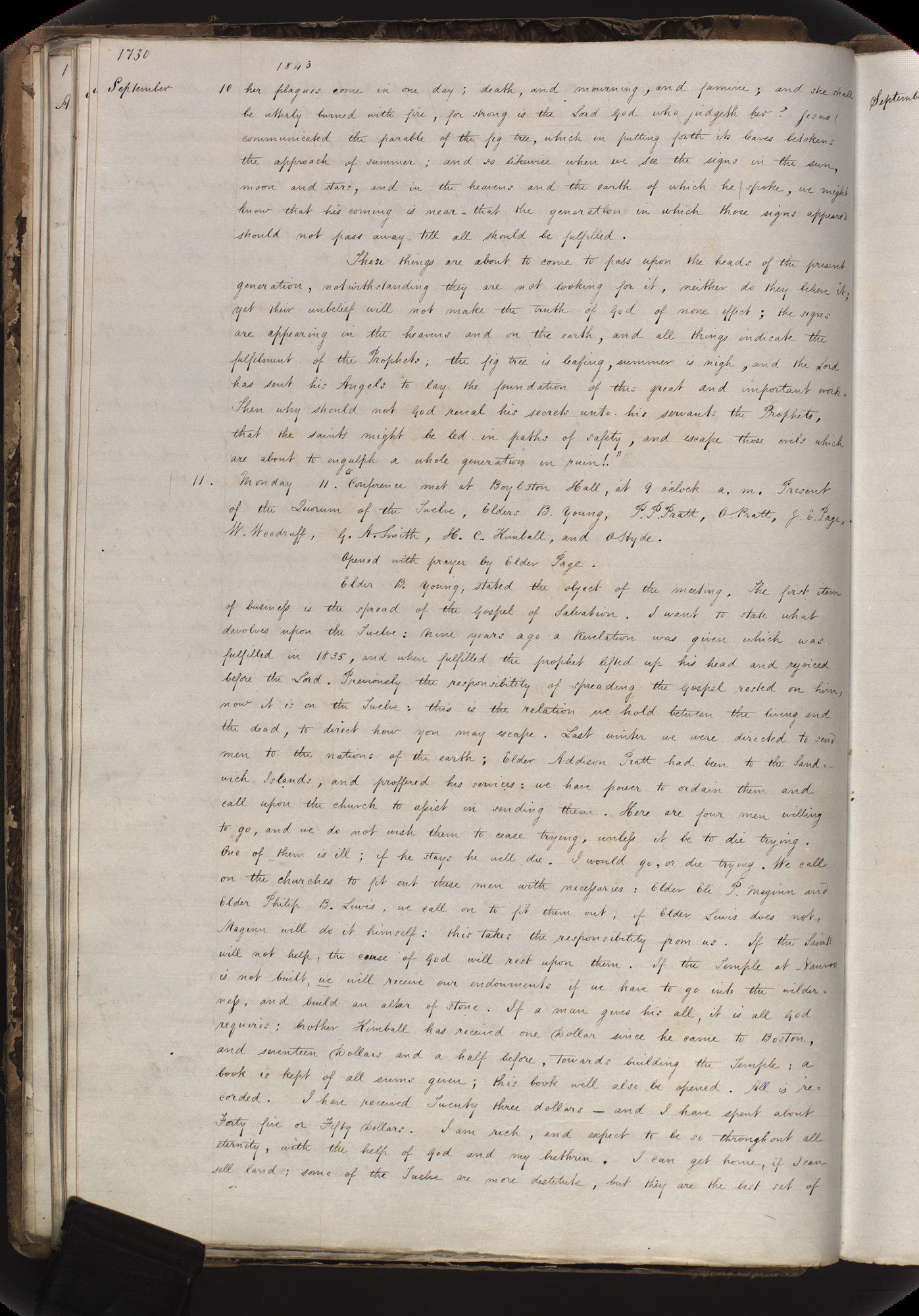 • Minutes of a 6–9 October 1843 general conference inserted under the date of 9 October at which pled his case in regard to his 13 August 1843 disfellowshipment and was permitted to continue as counselor in the First Presidency.